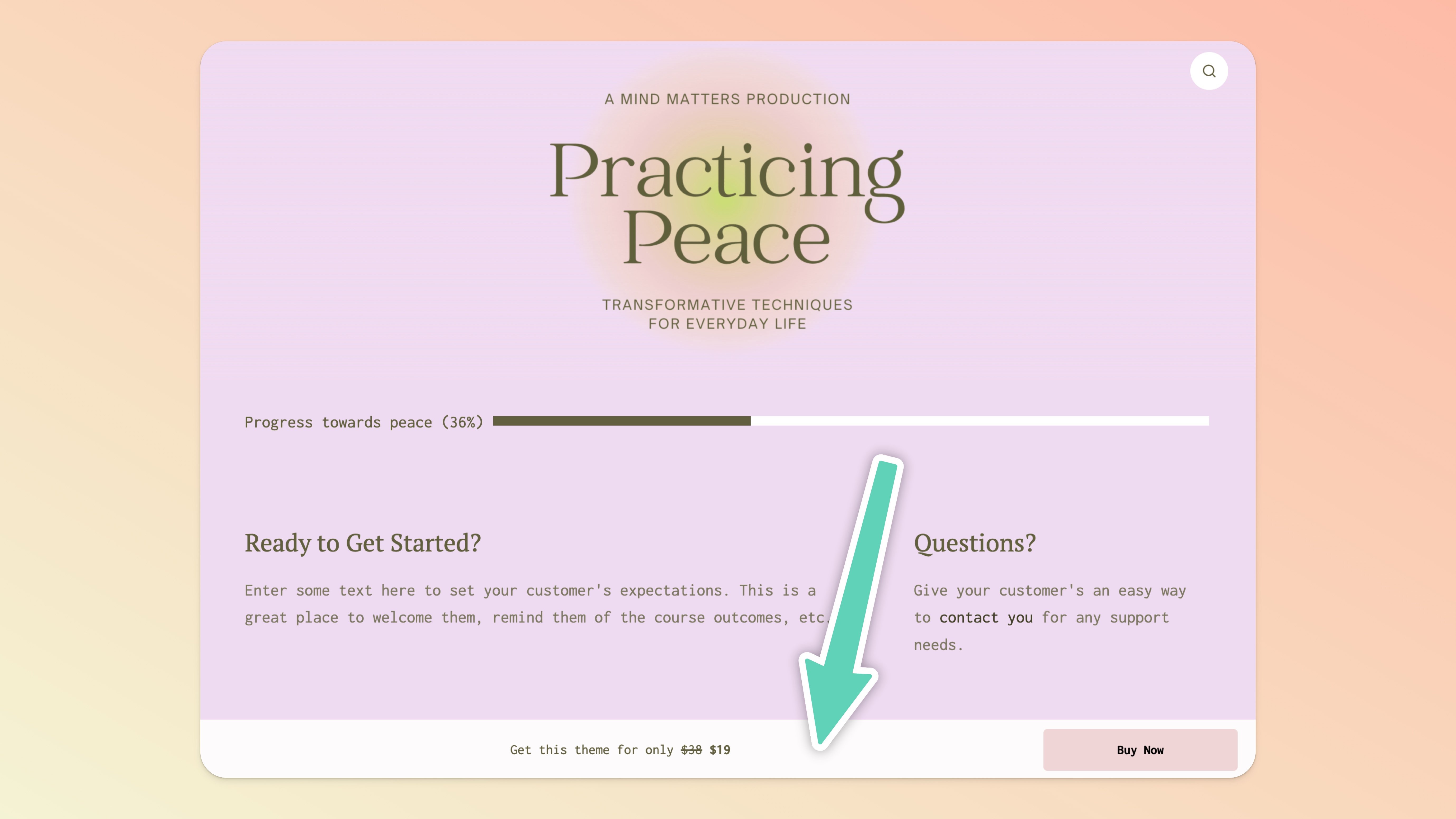 The Theme Bar has customizable text, colors, and a button that you can link to a Payment Page you’ve created within the Theme to sell it!