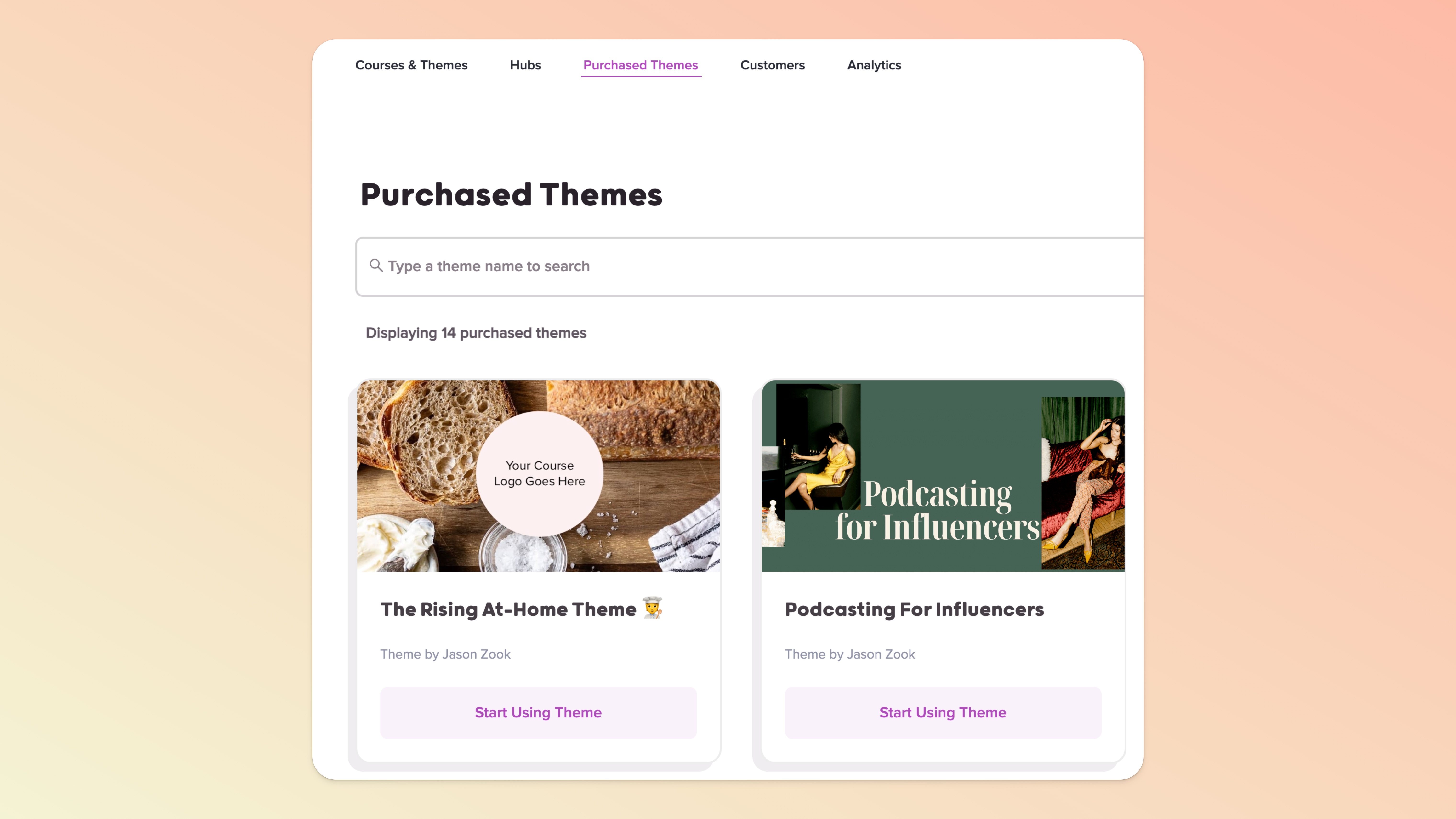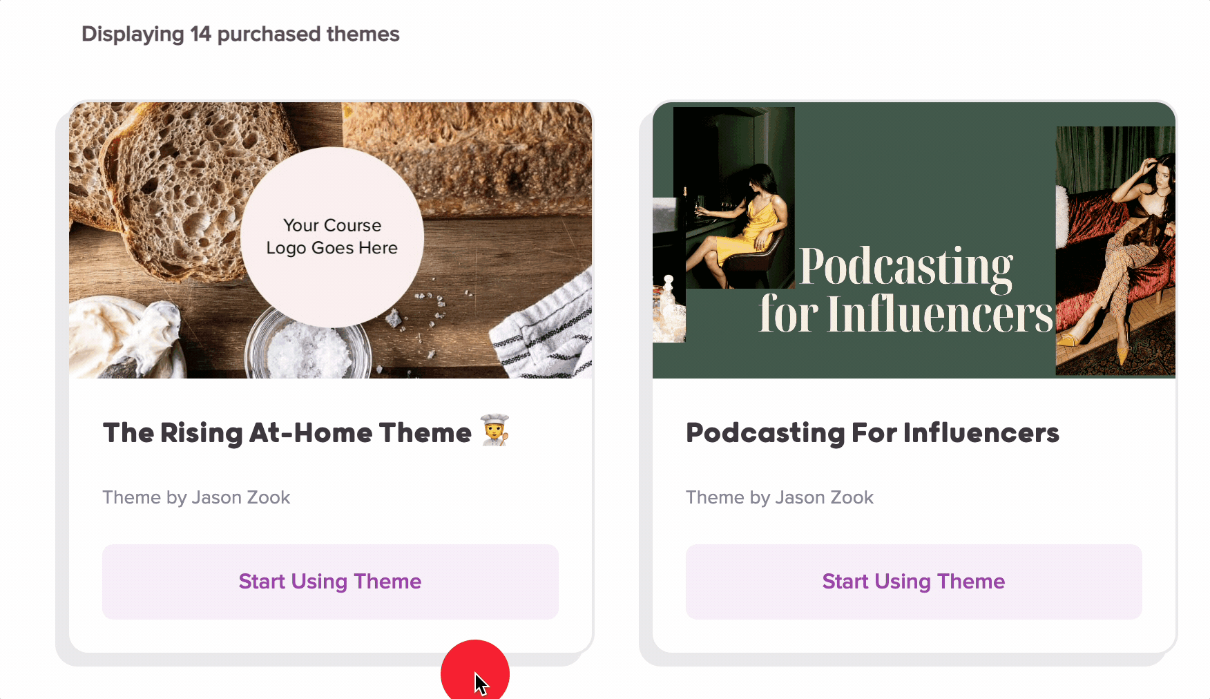 In the Teachery Dashboard, a new section will appear called Purchased Themes. Your customer can click the "Start Using Theme" at any time from this section to create a new course from your awesome Theme.
