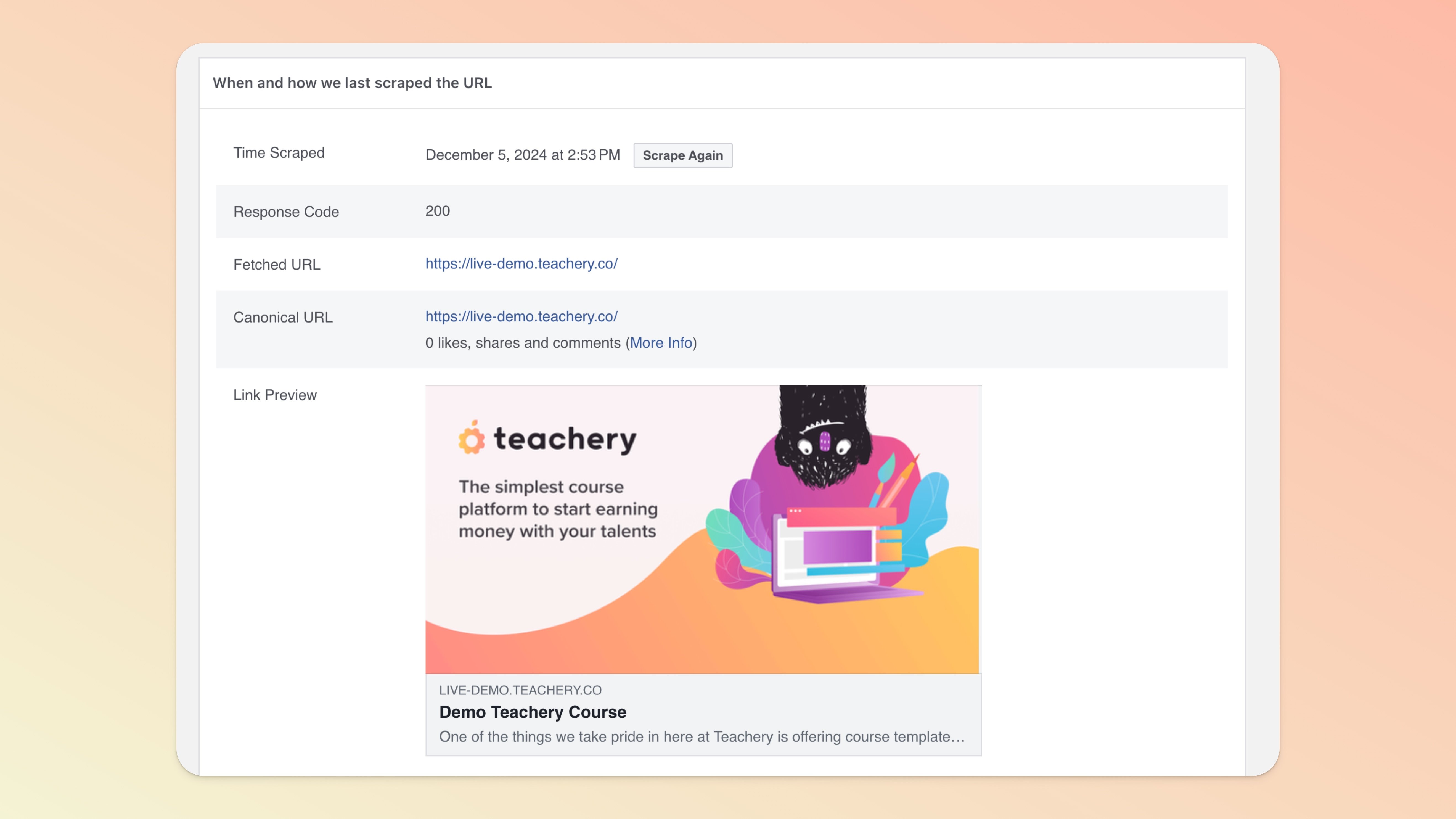 Preview your Course URLs on Social PlatformsThe most reliable social sharing image test is the Facebook Sharing Debugger. Add your Teachery Course URL (main Overview page). You can also use Social Share Preview for X, Linkedin, etc but it’s not 100% reliable.