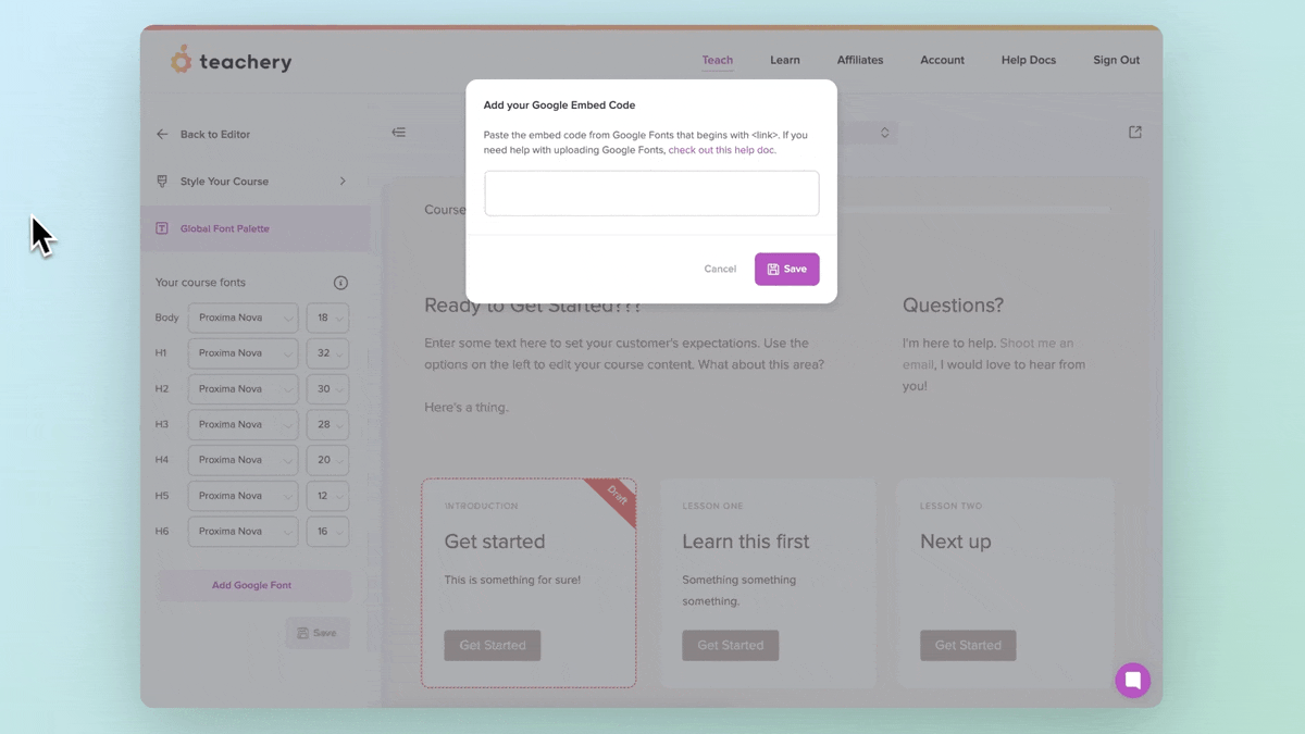 Step #2: Add Google Font Code and Set Your FontsWhile editing any Course or Theme, click into the Style Your Course section of the left sidebar, then click Global Font Palette.