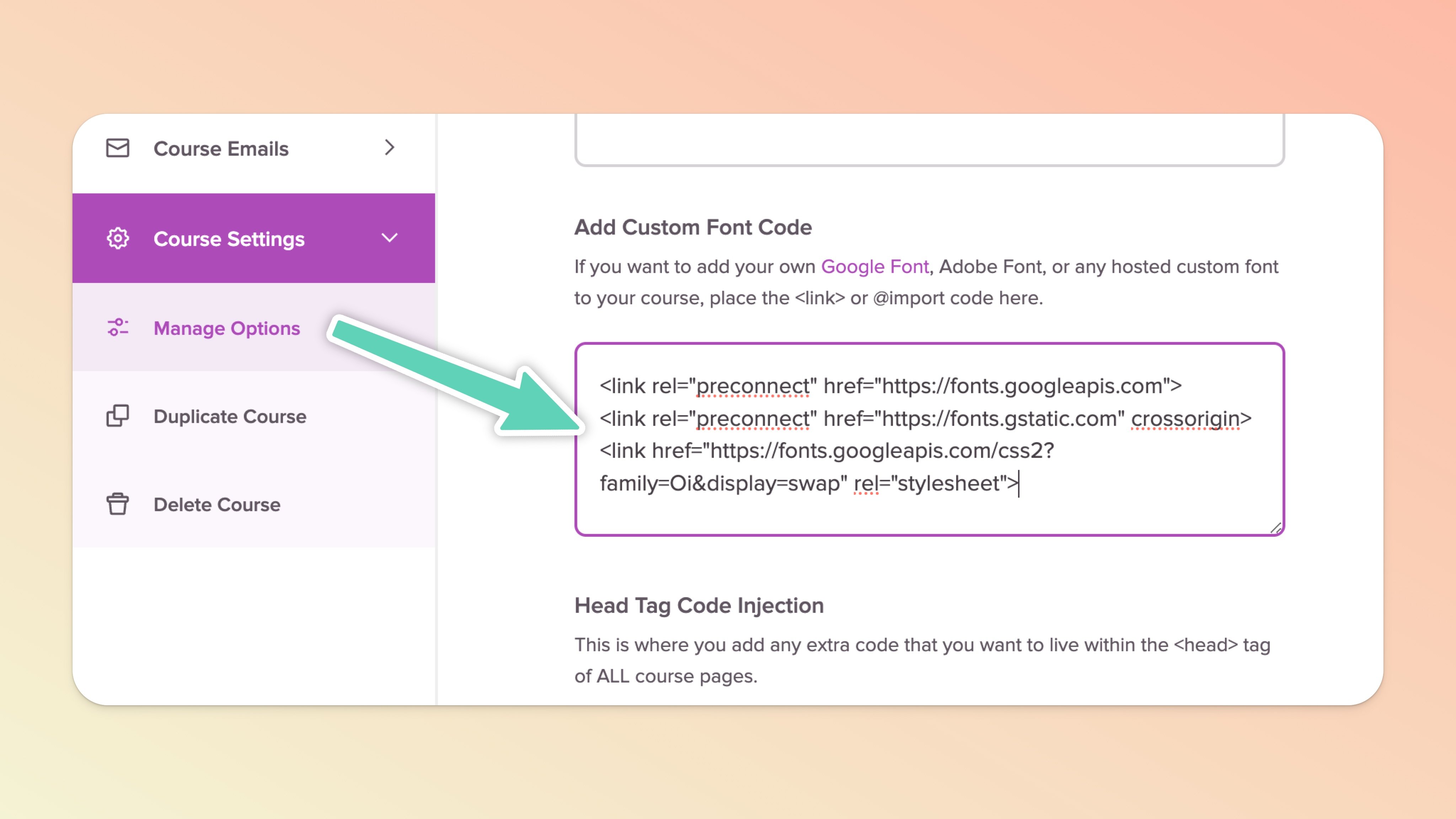 The code you just copied from Google Fonts we're now going to add to the Add Custom Font Script code area of your course's Manage Options page. Here's how to do that: