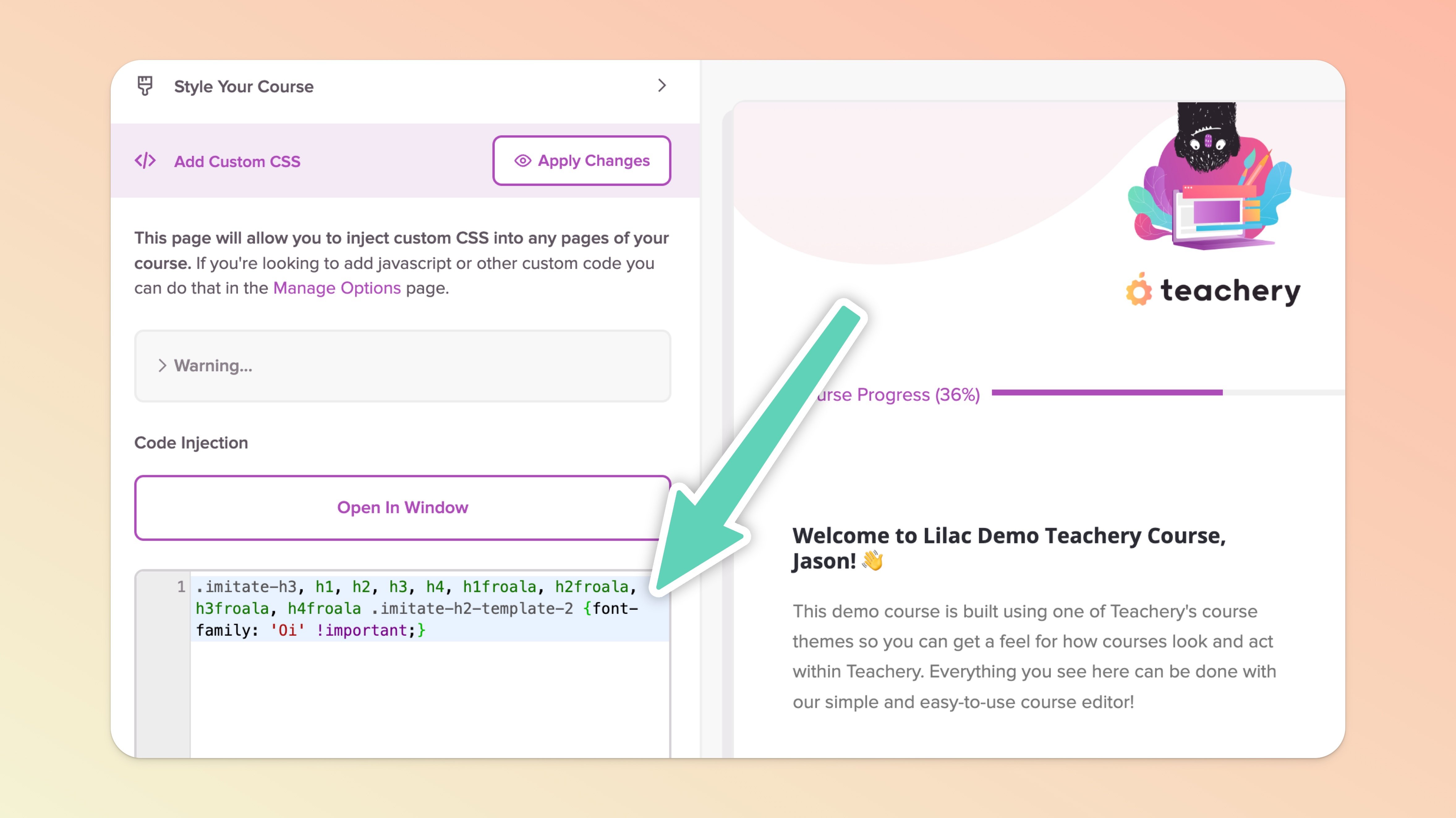 .imitate-h3, h1, h2, h3, h4, h1froala, h2froala, h3froala, h4froala .imitate-h2-template-2 {font-family: 'Oi' !important;}⬆️ In the code snippet above, you'll simply replace Oi with the name of your selected font. For example, if you are using the Google Font Fredoka, you'd have 'Fredoka' in your CSS instead of 'Oi'. Leave the !important part in the CSS code as that is needed to override Teachery's fonts.