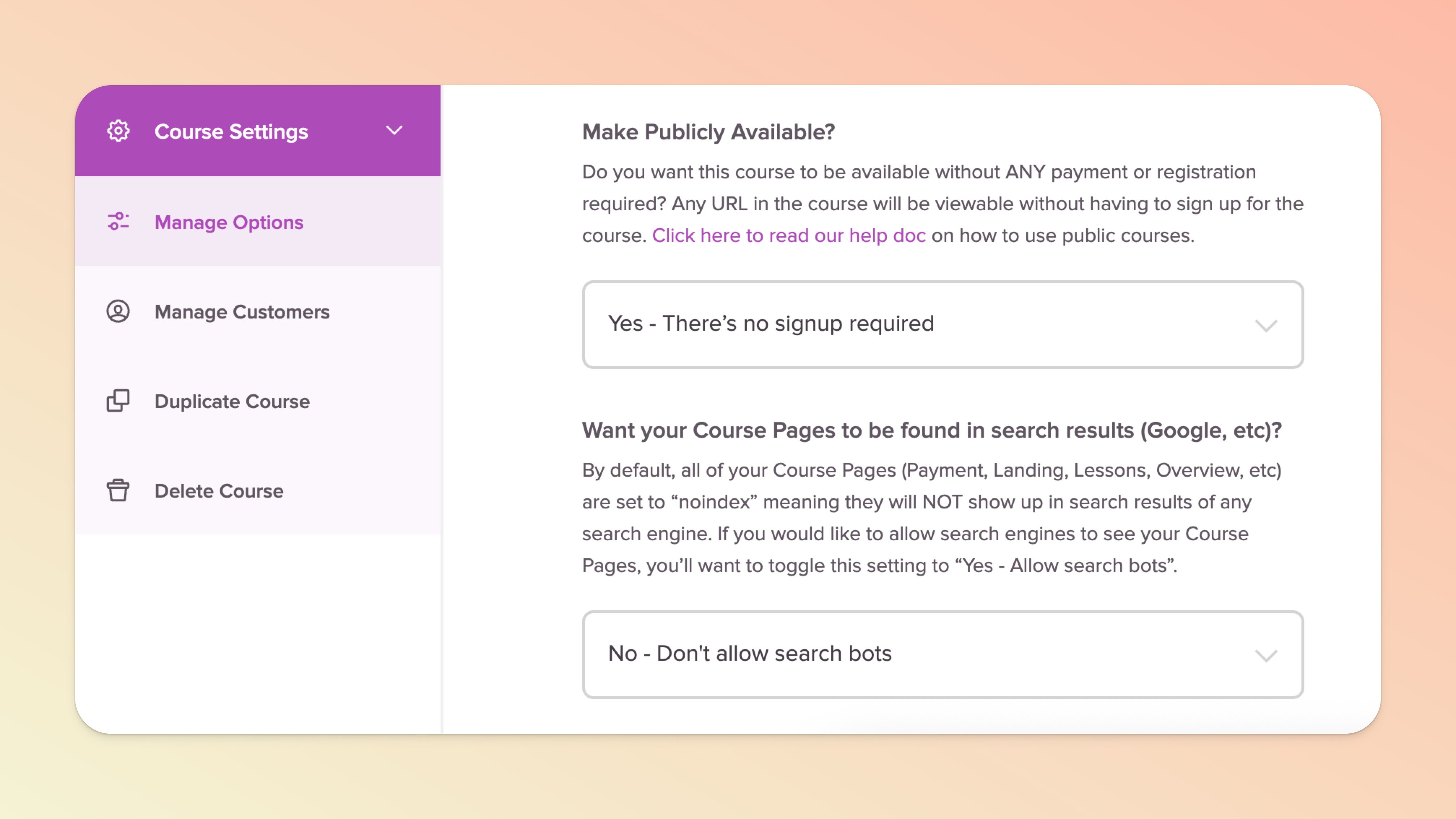 Just as you'd imagine, a public course lets anyone view your course and course lessons WITHOUT having to purchase or signup for your course at all.