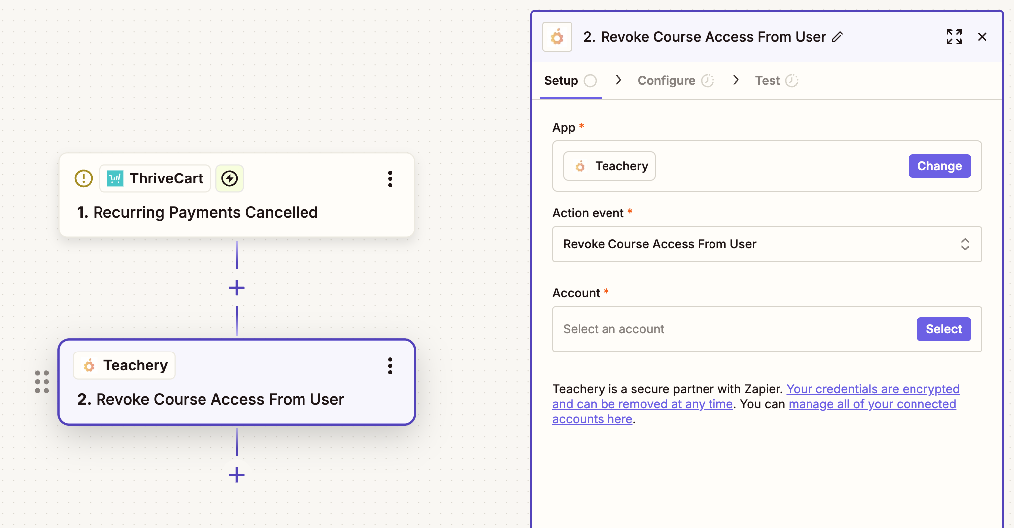 Then, Teachery will be the second trigger and you'll select "Revoke Course Access from User".
