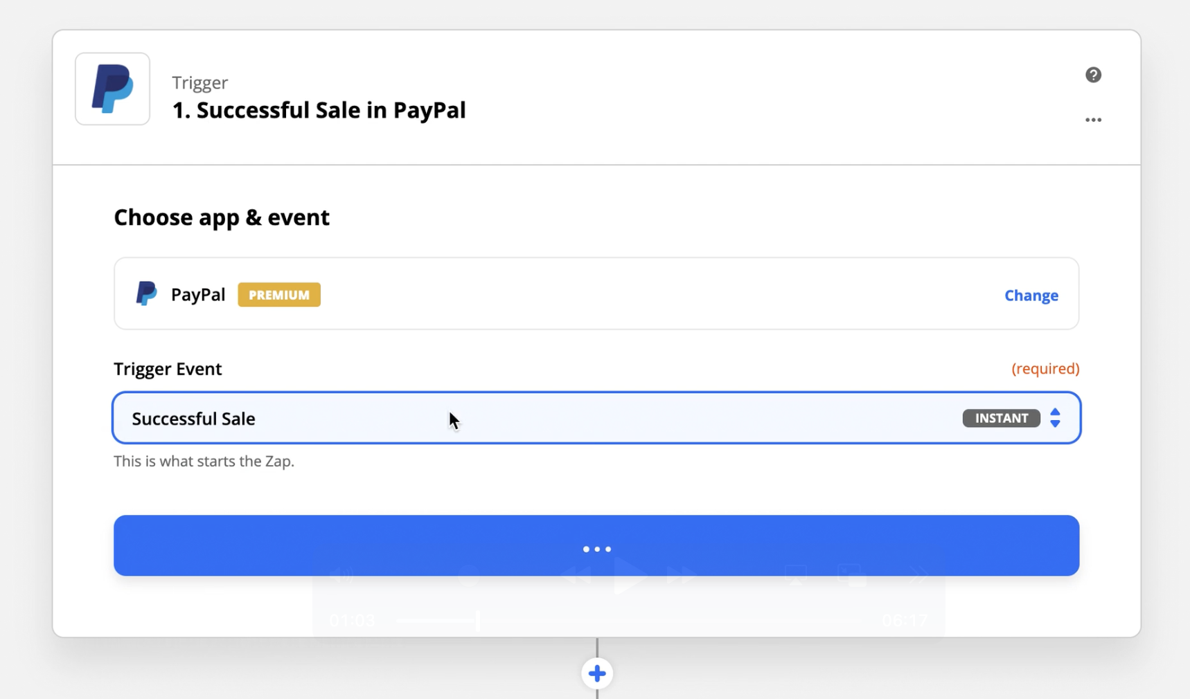 STEP #2: Select your Choose Trigger Event and you'll want to select the first "Successful Sale" option. This means ANY sale that comes through your PayPal account will trigger this Zap.