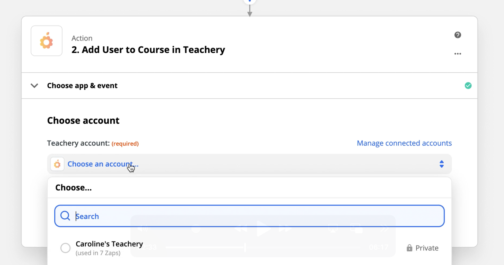 STEP #7: You'll connect your Teachery account to Zapier. Click the + Add a New Account link (I've already added my account in this screenshot)