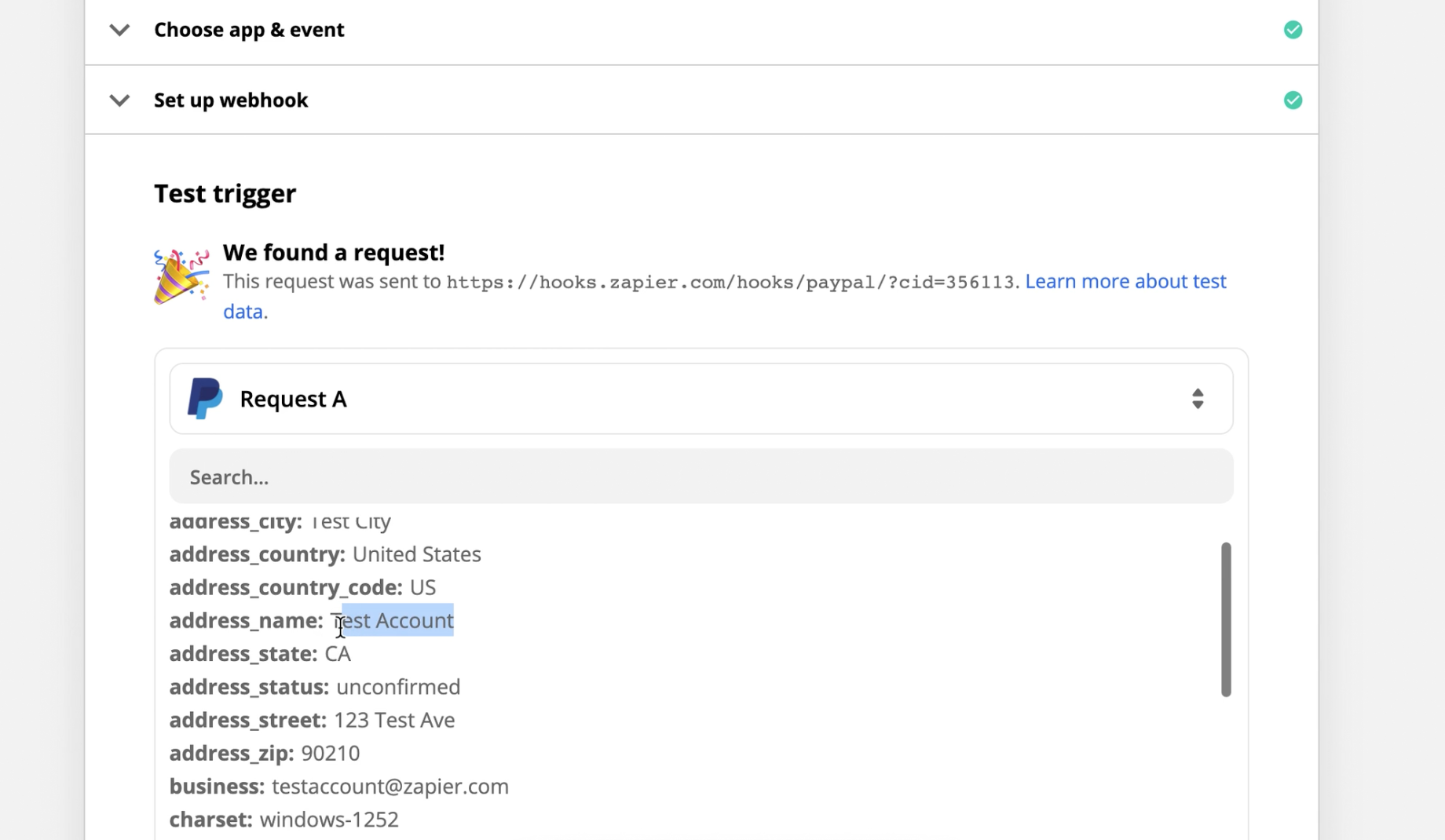 STEP #4: Pull in your Test Data from PayPal and review it. This is great for you to be able to see where the Email Address, First Name, and Last Name are located in the PayPal purchase data (you'll use these in the Teachery step of the Zap!)