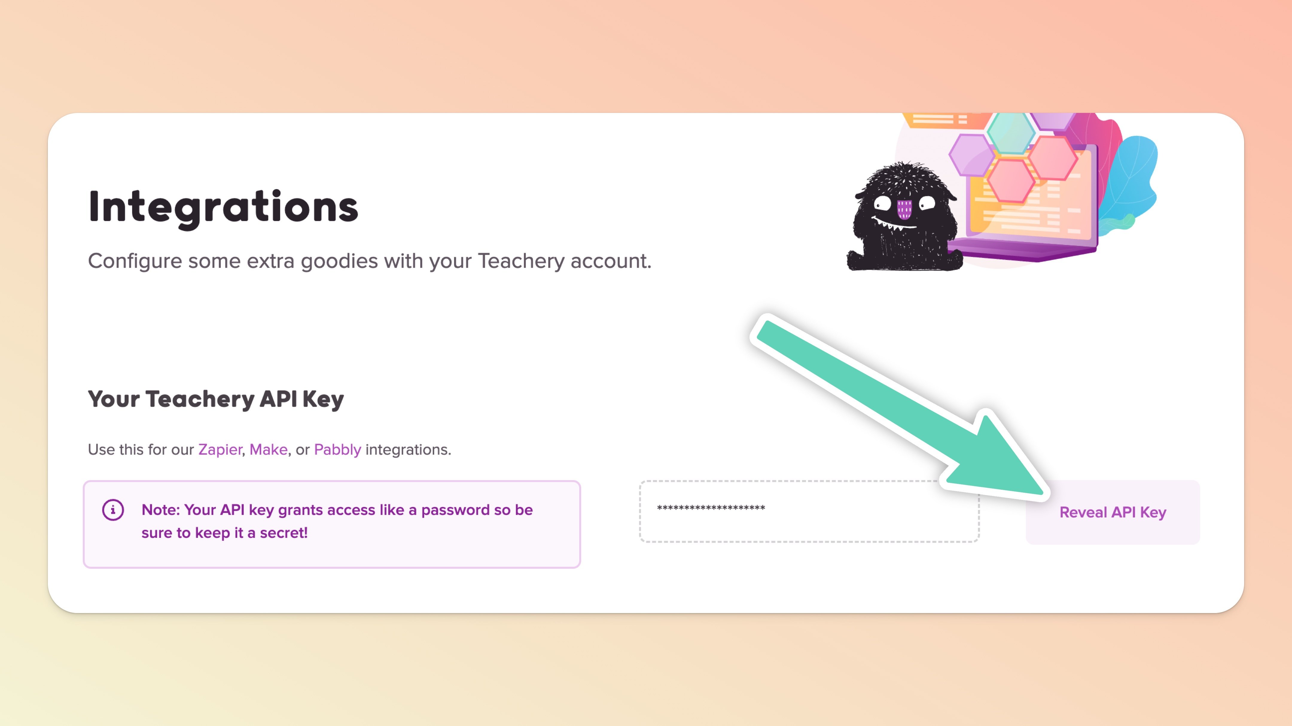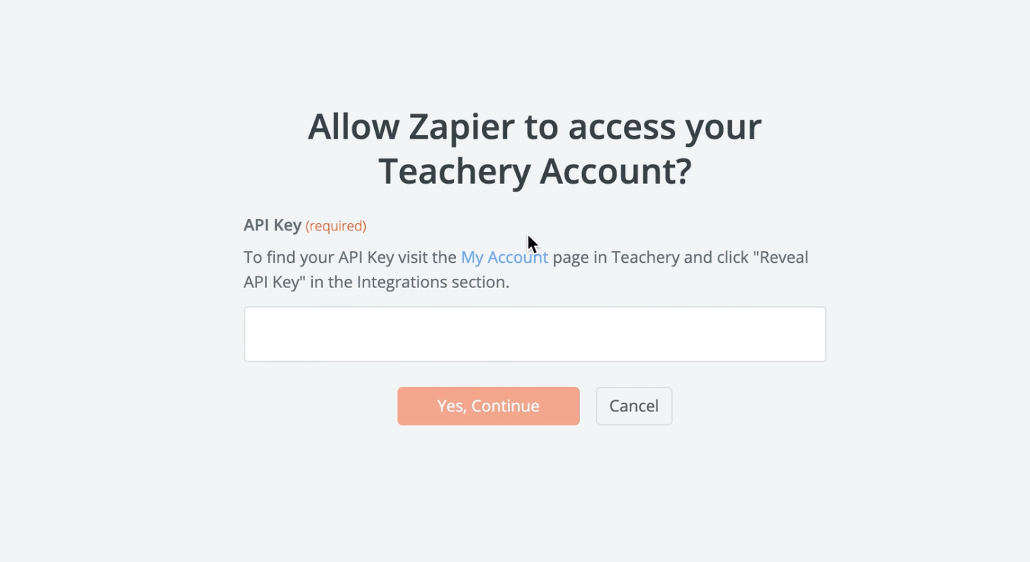 STEP #4: Zapier will open a pop-up window and ask you for your Teachery API Key. You can find this in your Account > Integrations section.