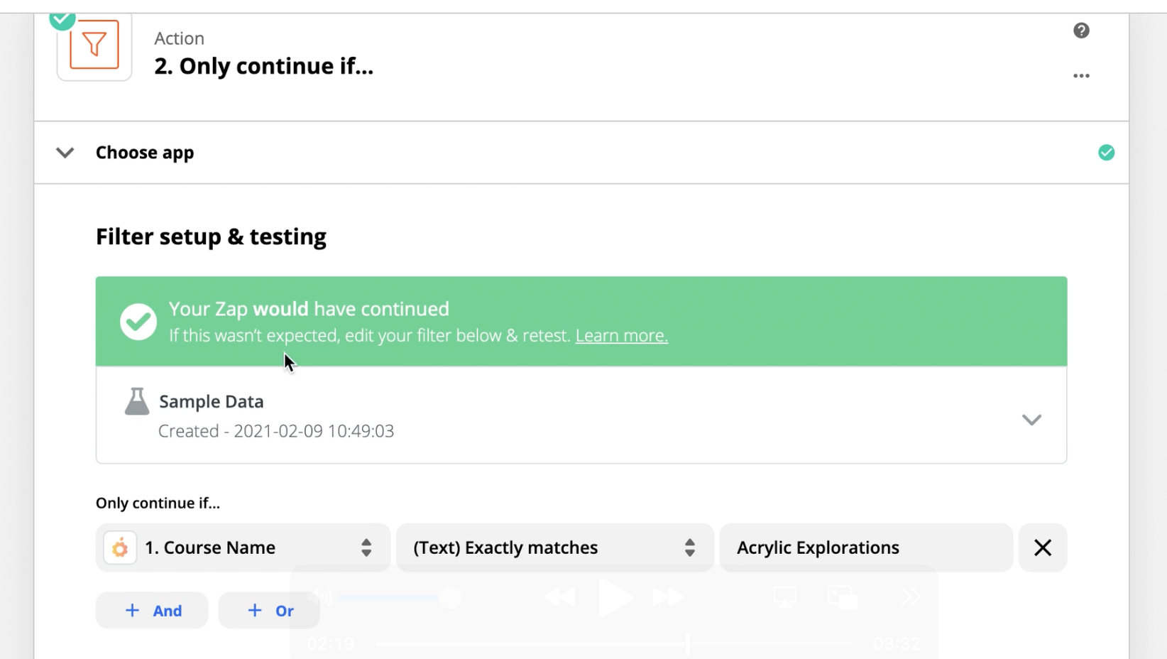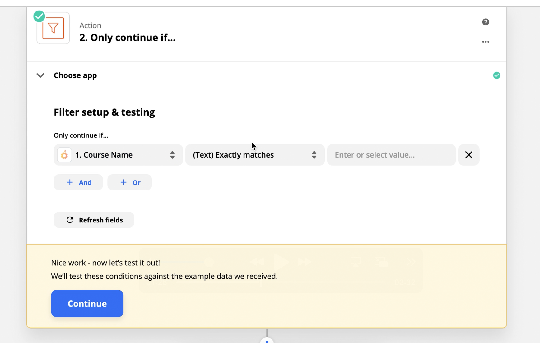 This example Filter (Only continue if...) step is how you can only have a Zap fire for ONE course if you have multiple courses in your Teachery account: