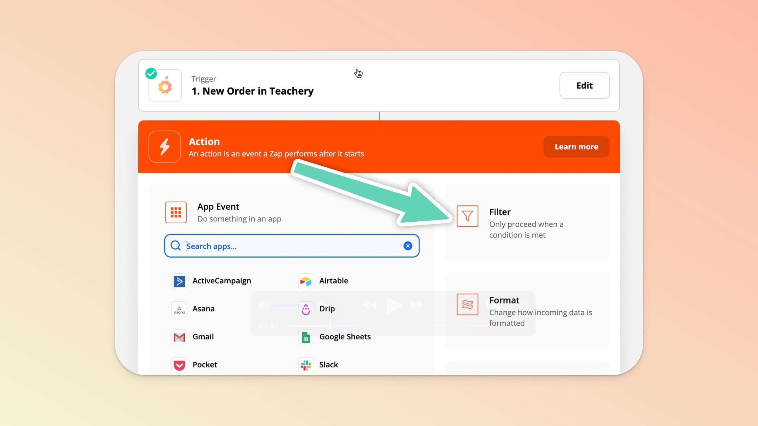 Don't forget about Filters and adding additional steps to your Zapier Zaps!Filters are a powerful way to add extra conditions to your Zaps. Especially if you have multiple courses in Teachery, using Filters will help you select different courses when you set up your Zaps.
