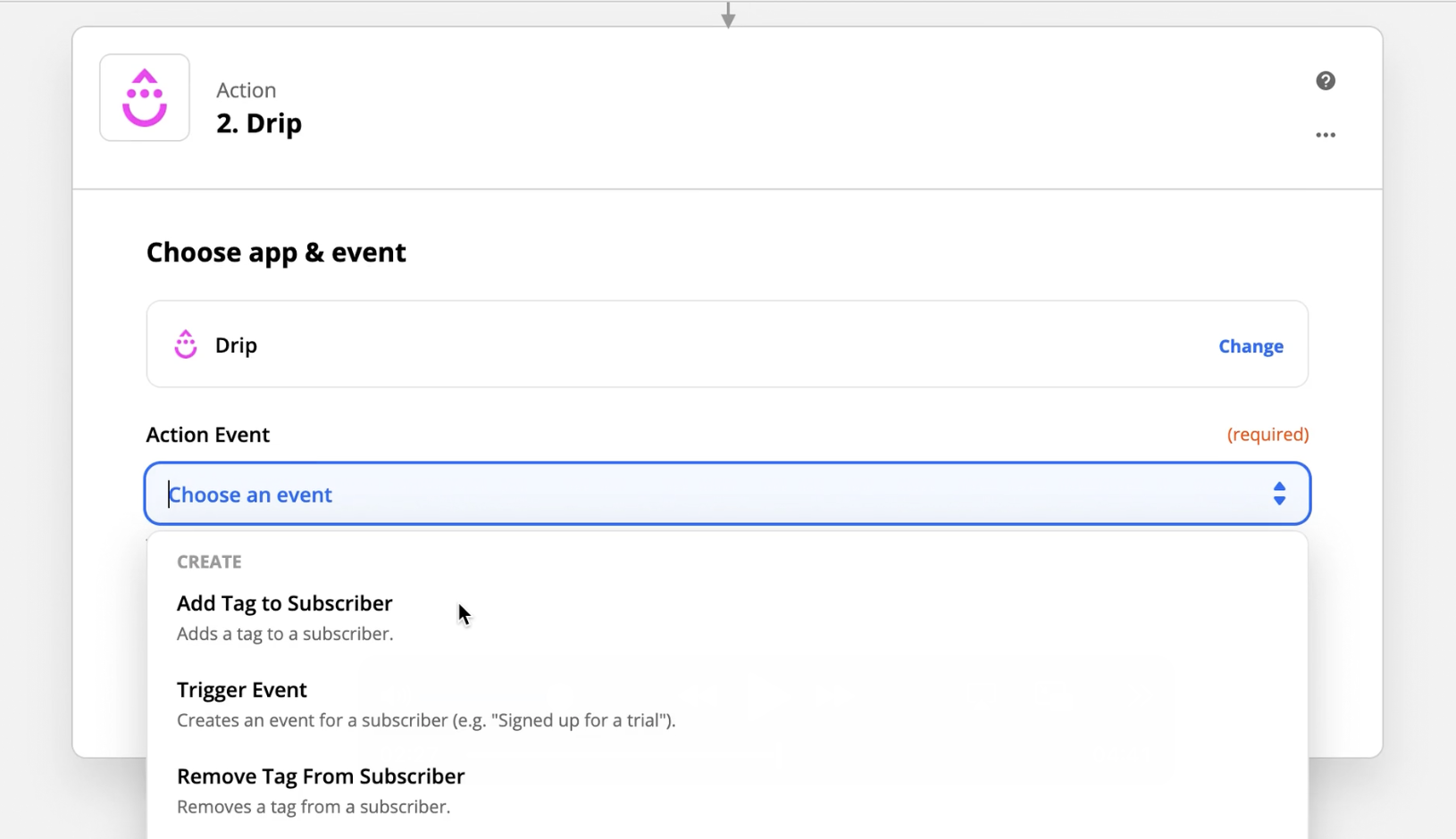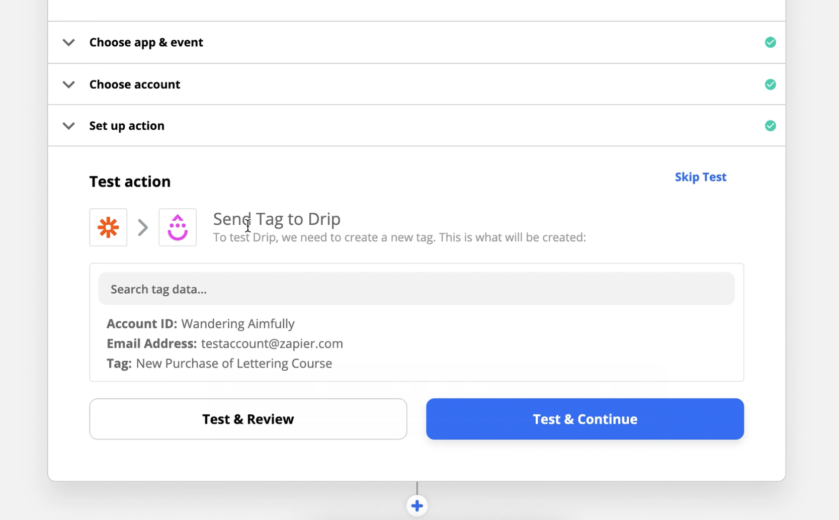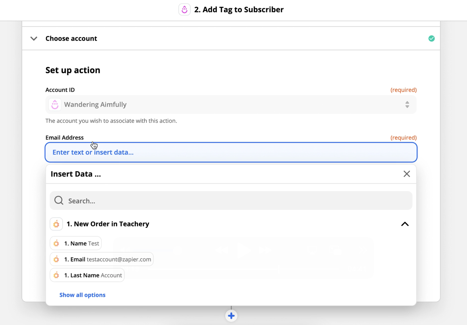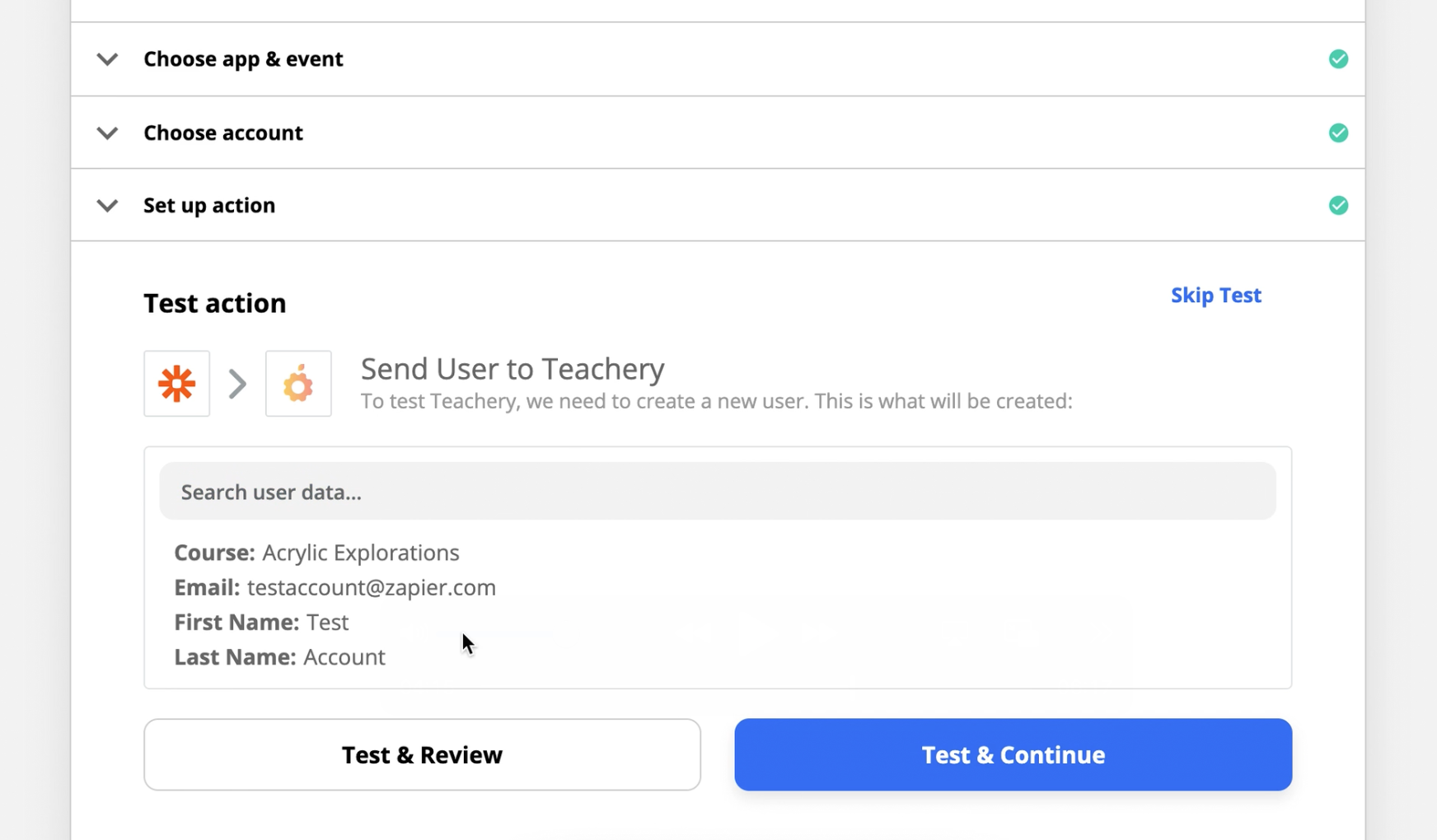 You should do this step but *IMPORTANT* note that whatever data you selected from your Teachery Test Data will be sent to the app you choose (for example in Step #7, the email address "[email protected]" will be sent to the connected Drip account).