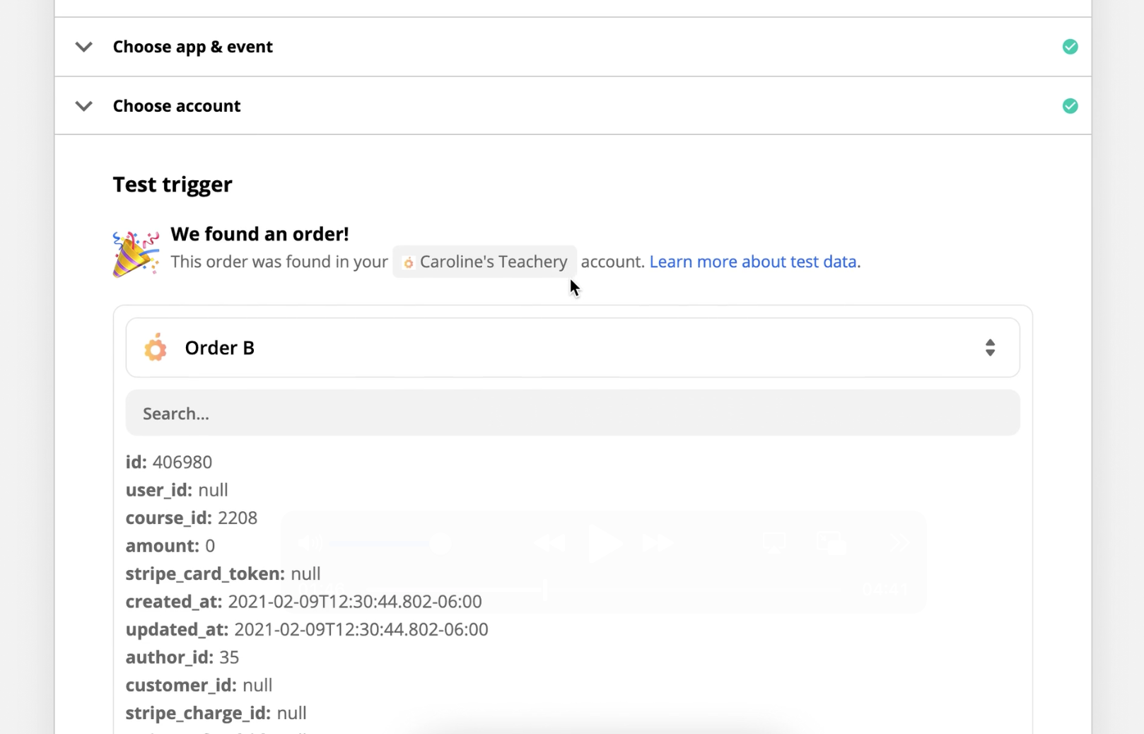 STEP #9: You'll choose what Teachery Course to zap your PayPal data into and then choose what PayPal data to pull from moving forward (this is where the Test Data from PayPal comes in).