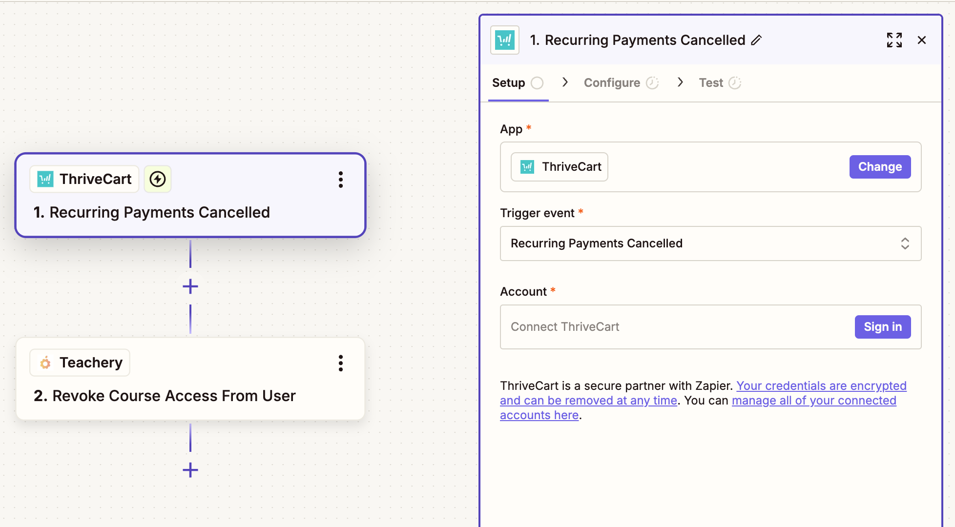 Thrivecart will be the first step in your Zap and you'll find the "Recurring Payments Cancelled" trigger event for Thrivecart.