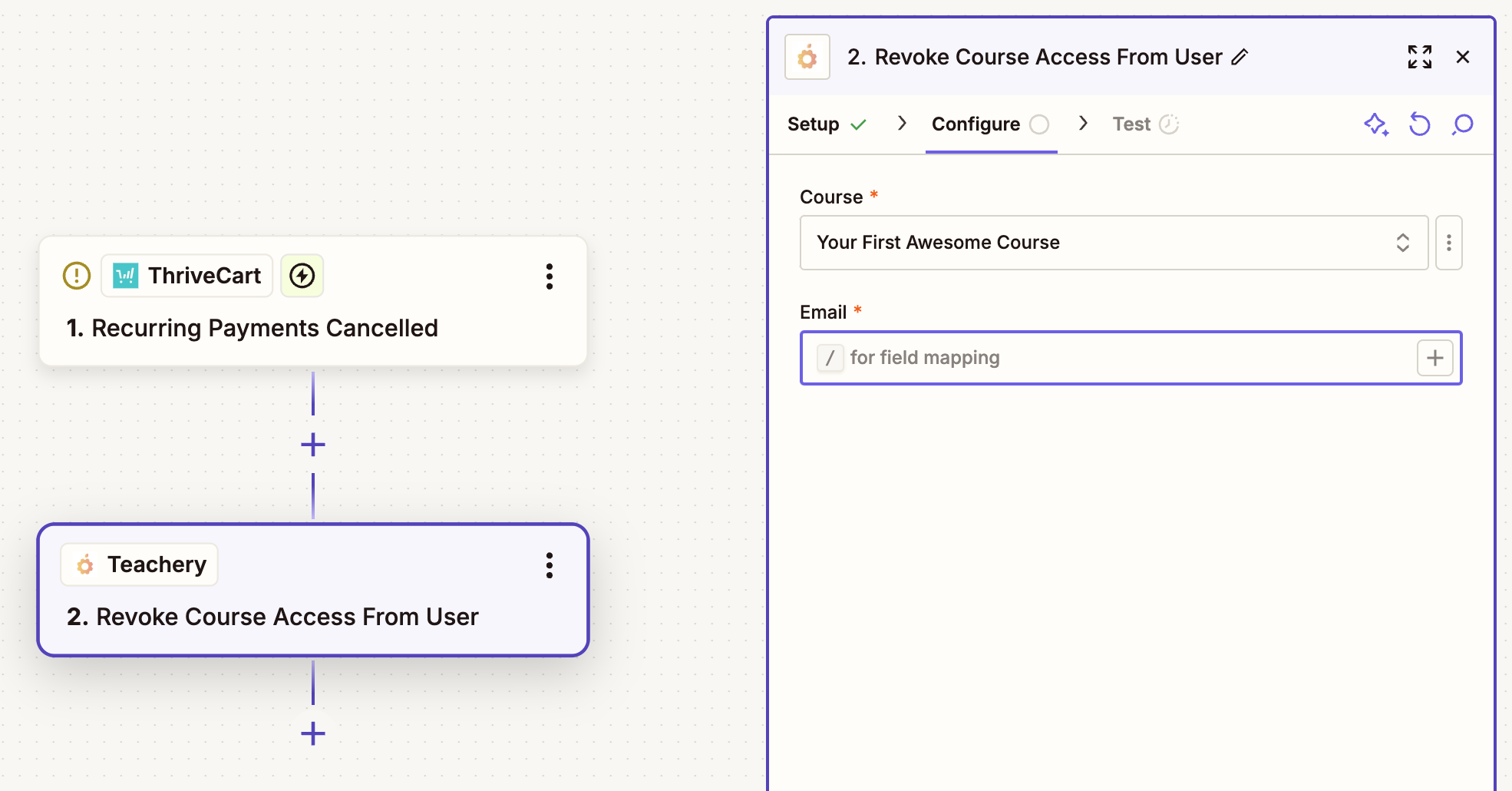 *If you want to revoke access to multiple courses in the same Zap, you'll simply add ANOTHER trigger of Teachery > Revoke Access (you can add as many of those as you like/need in the same Zap!)
