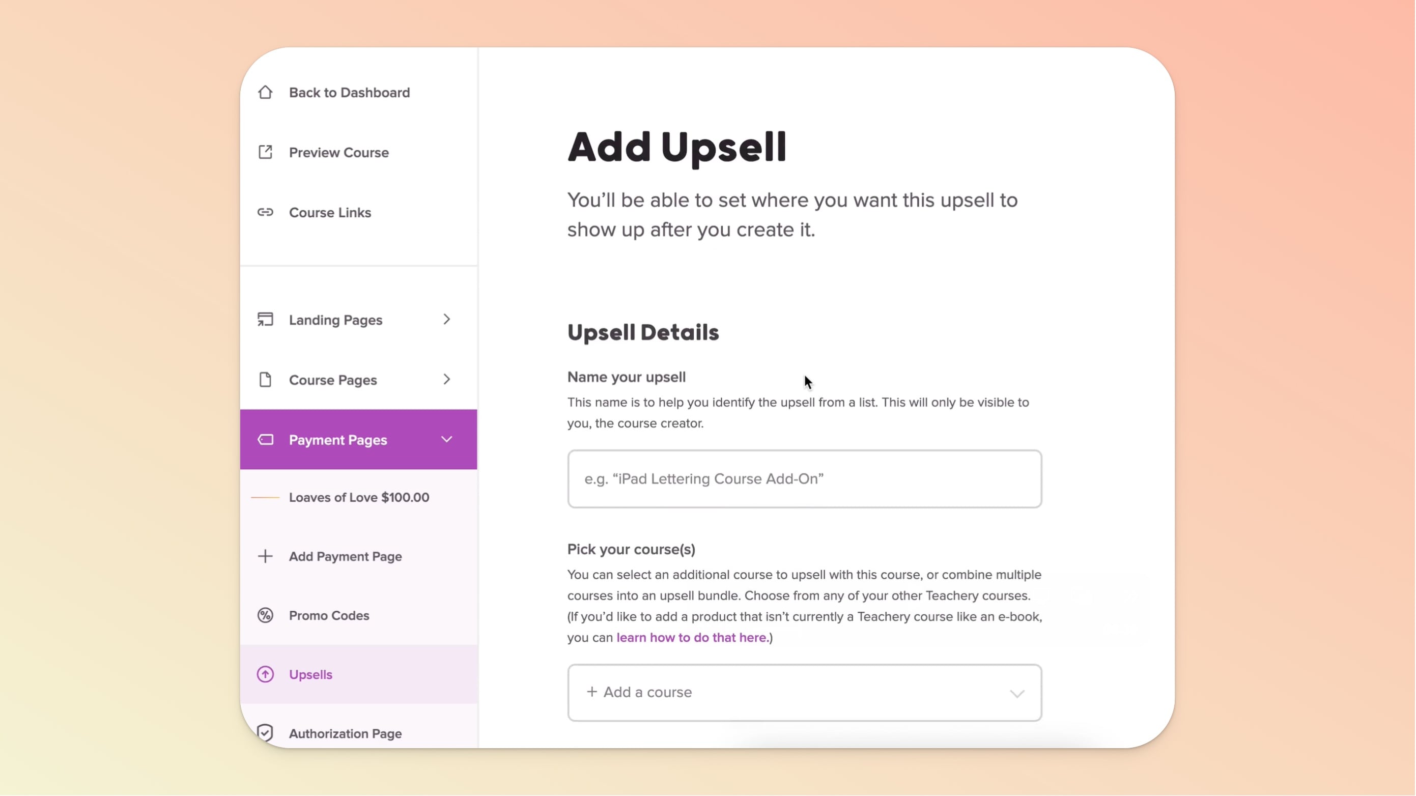 The Upsells feature can be found inside any course under the Payment Pages section of the left sidebar editor. Once you click into the Upsells section you'll be able to create a New Upsell!