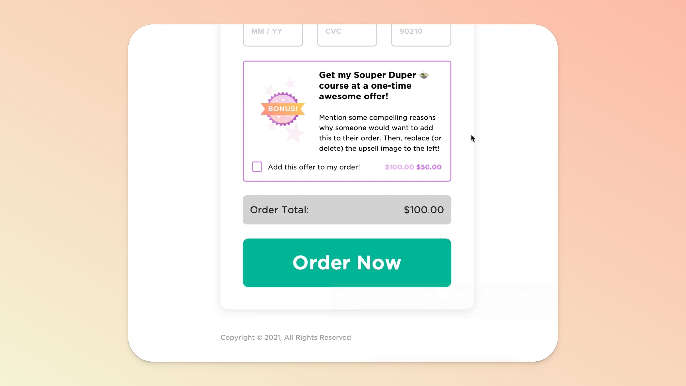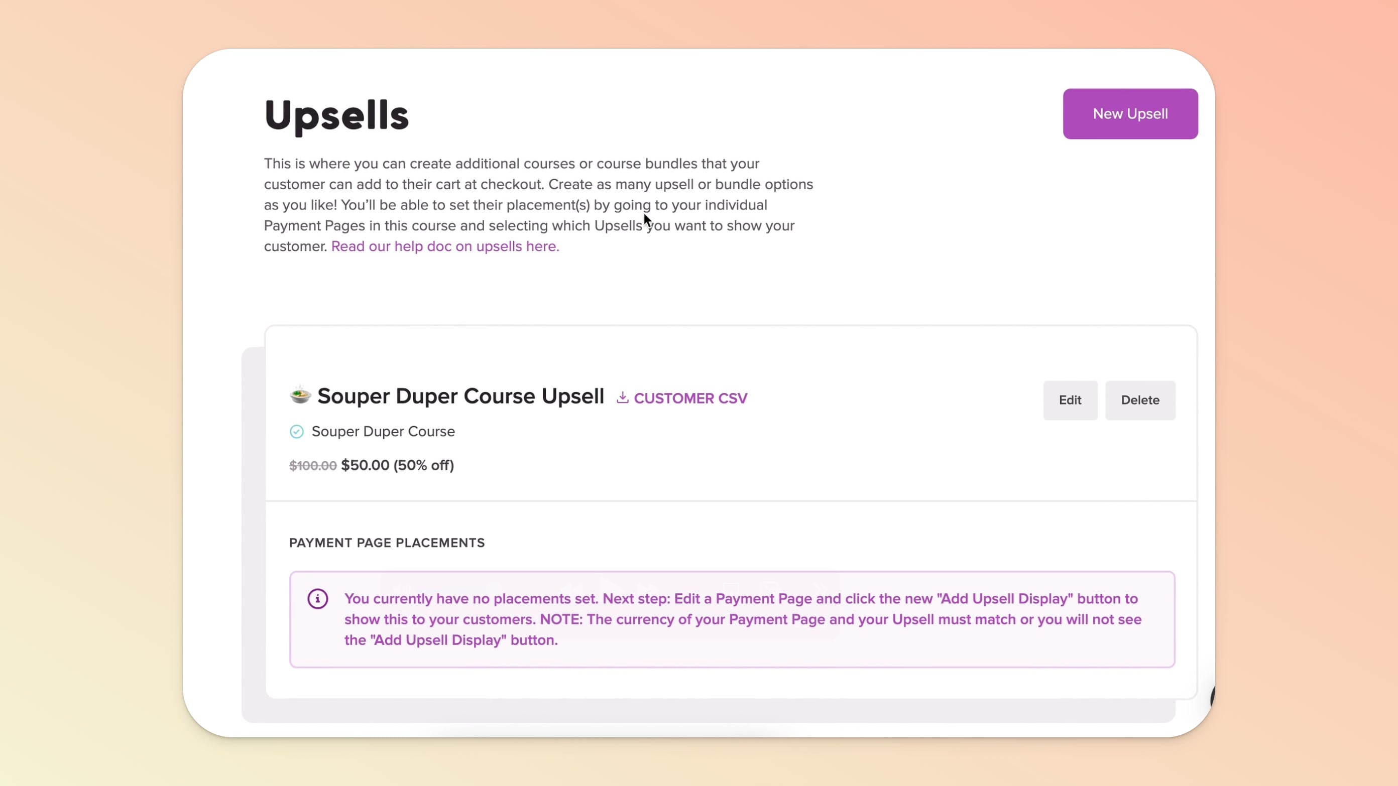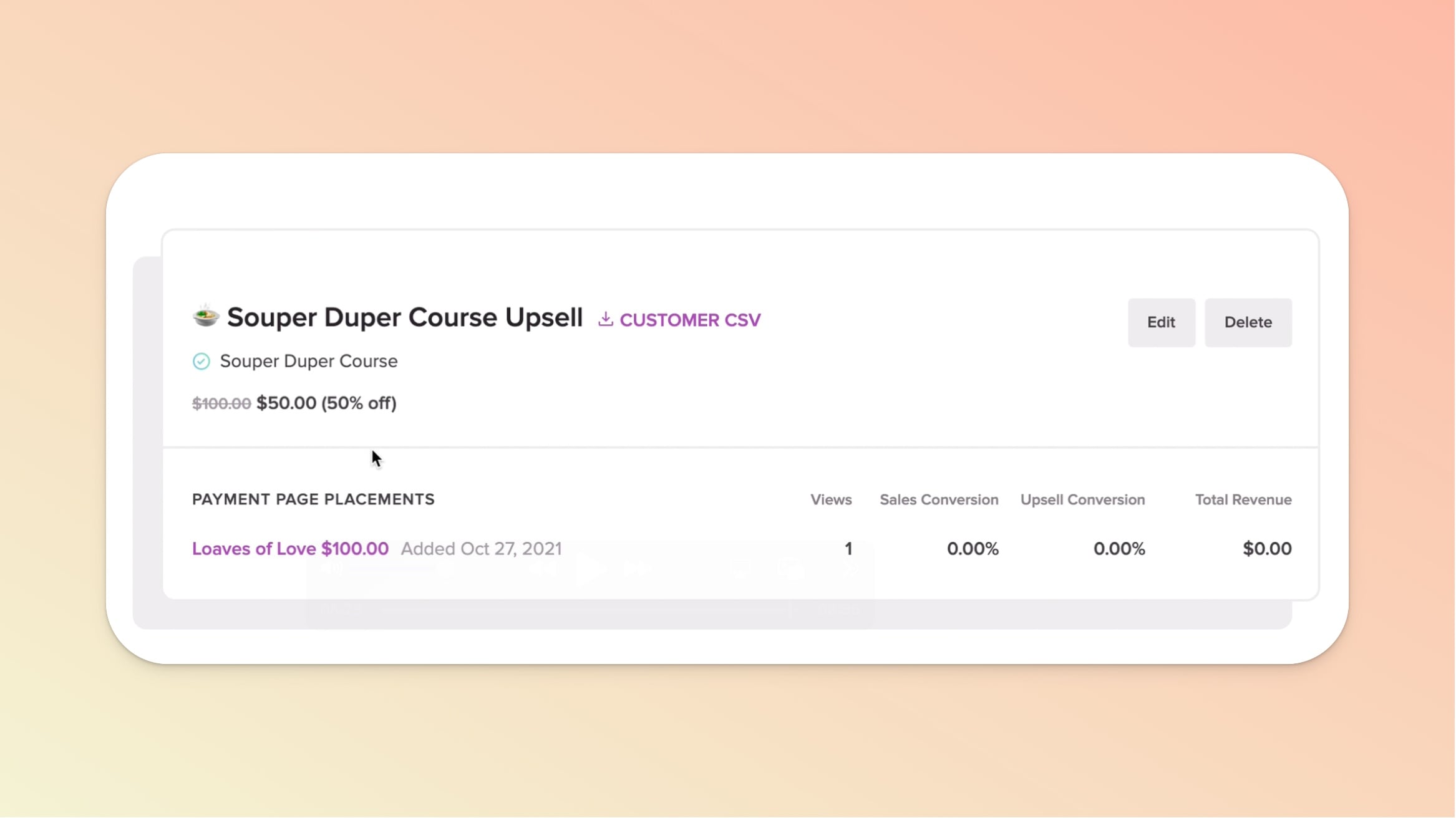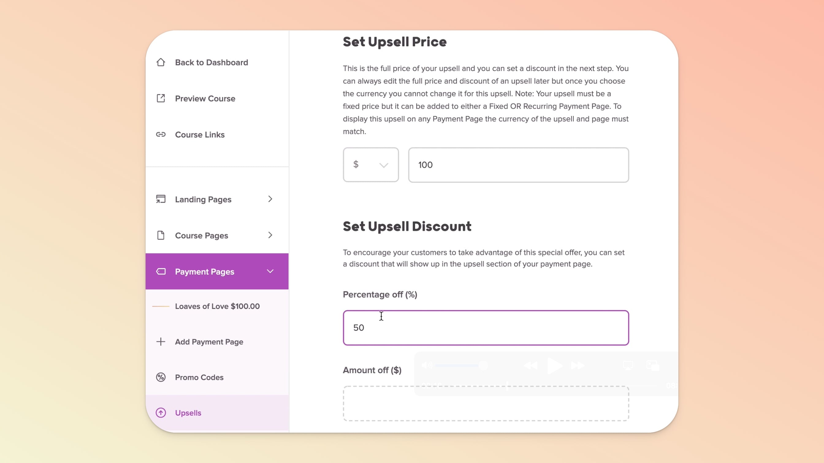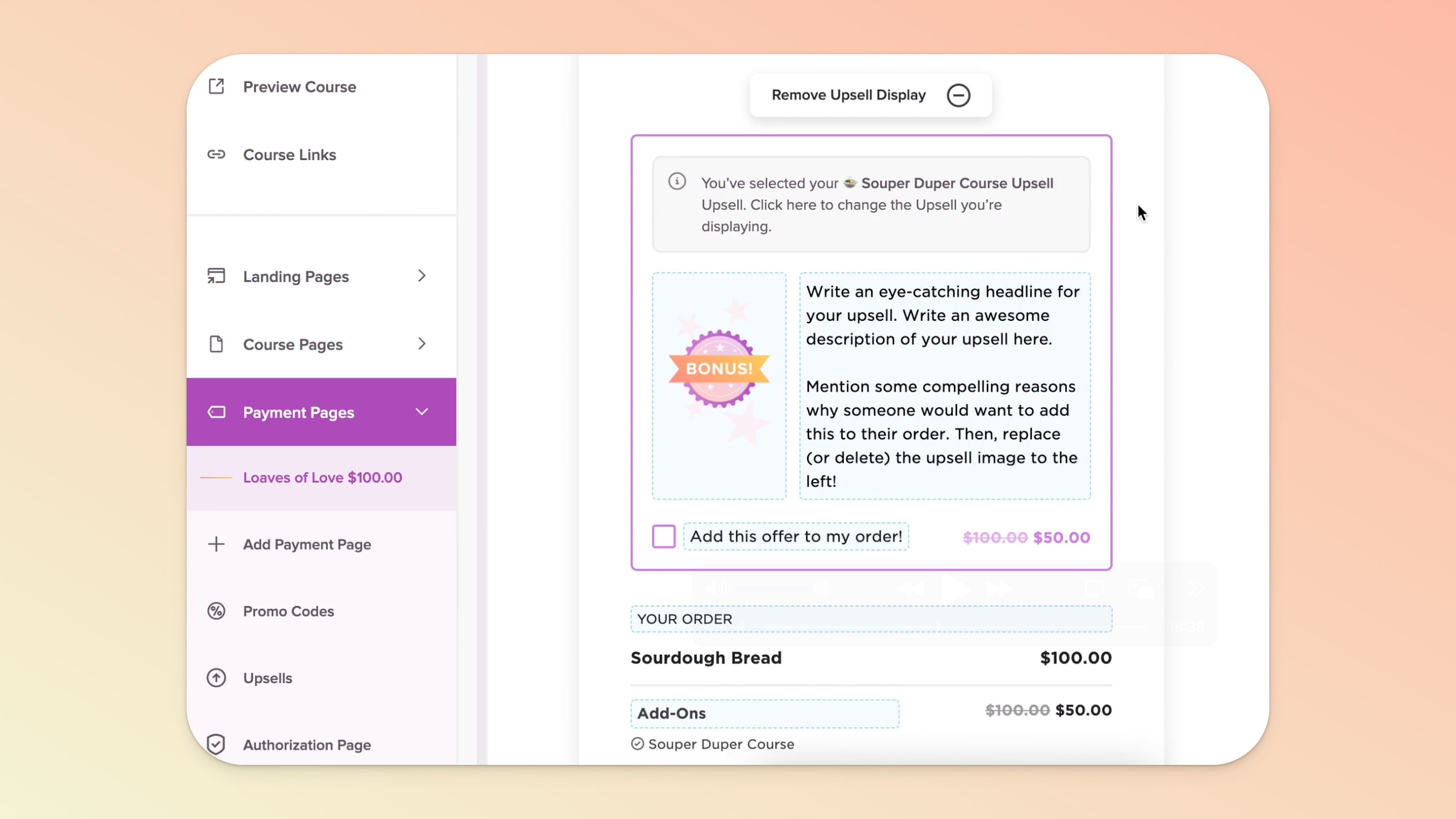 Souper Duper Course is $100. You want to offer a discount to entice customers to grab the Upsell offer, so you set a 50% OFF discount (you can do % OFF or $ OFF). The customer will later see the full price crossed out and the Upsell price of $50 like this: