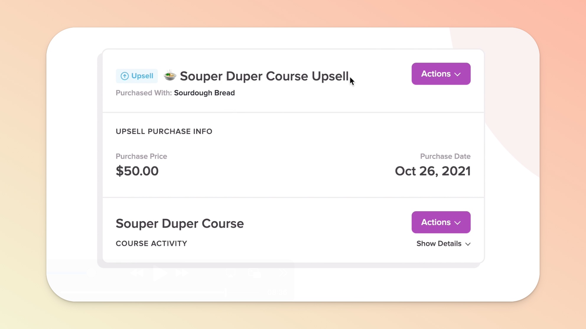 If you click into view your Customer's Profile, you'll see we add a secondary "course card" for the Upsell Course. We do this so you can take the following actions on the Upsell itself (separate from the "Main Course"):