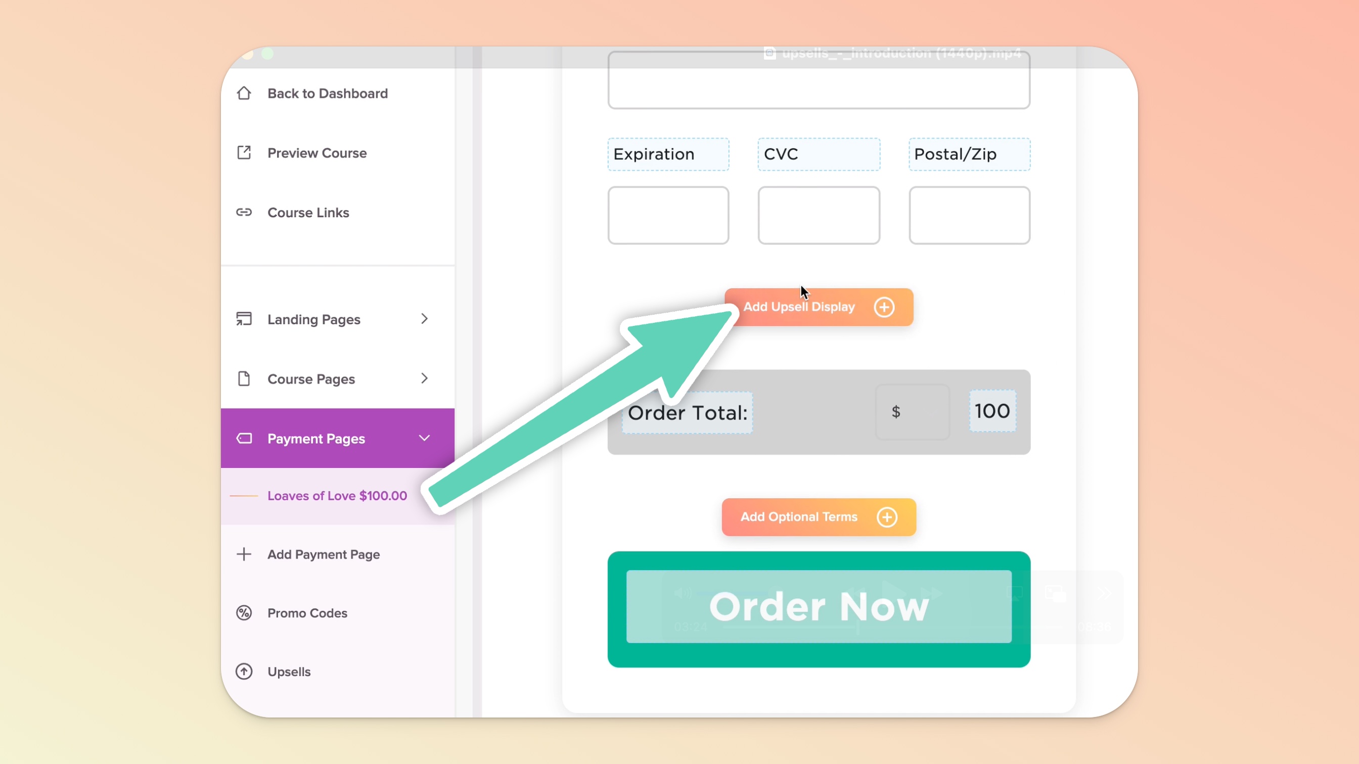 Once you're viewing the Payment Page, scroll down below the Payment Information section and you'll find an "Add Upsell Display" orange toggle button.