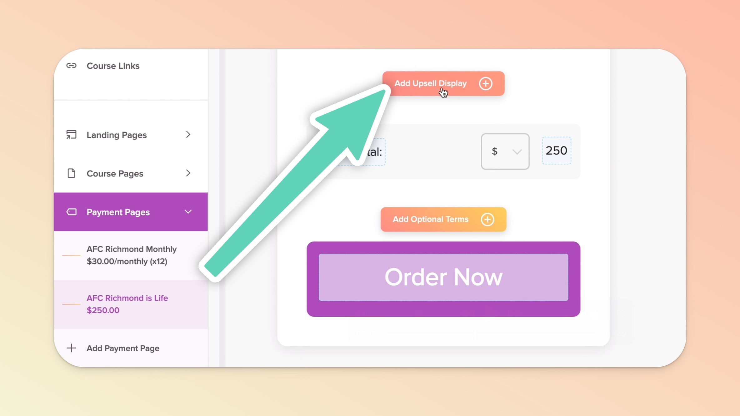 Either way, once you have your $250 Payment Page you can edit it and scroll down to find the "Add Upsell Display" button, and add your Upsell Bundle: