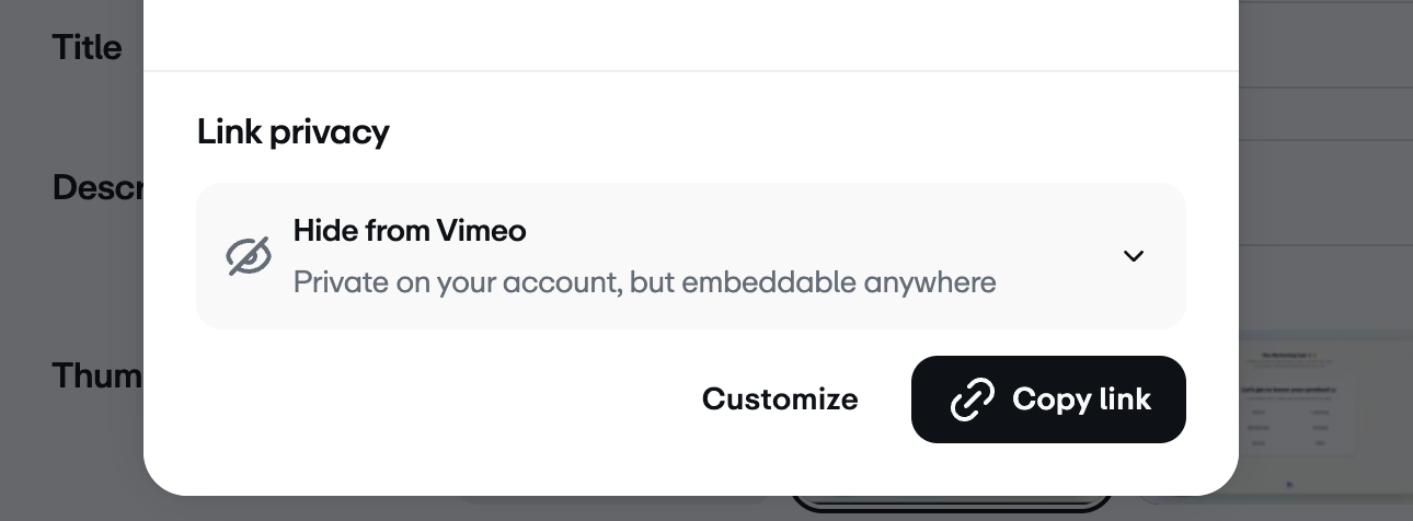 We recommend using the Hide from Video privacy setting if you want to embed your videos but still have them hidden from search/sharing in Vimeo. Once you select this privacy setting, only THEN grab the embed code and insert it into a Content Block (or quick add using the + icon in any text area) in Teachery.