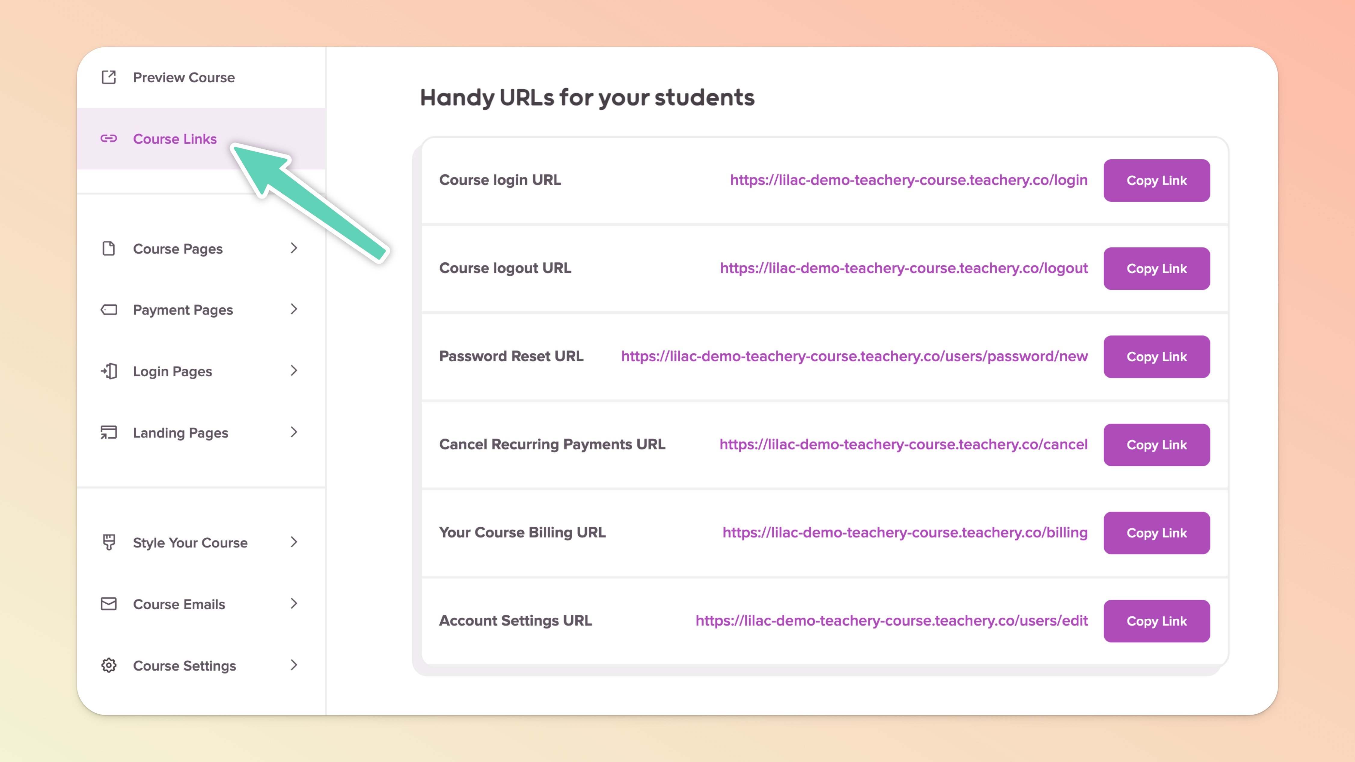 The Handy URLs section of Course Links This URL is perfect to give to any course customers who misplace the course Welcome Email and need to get back into your course.