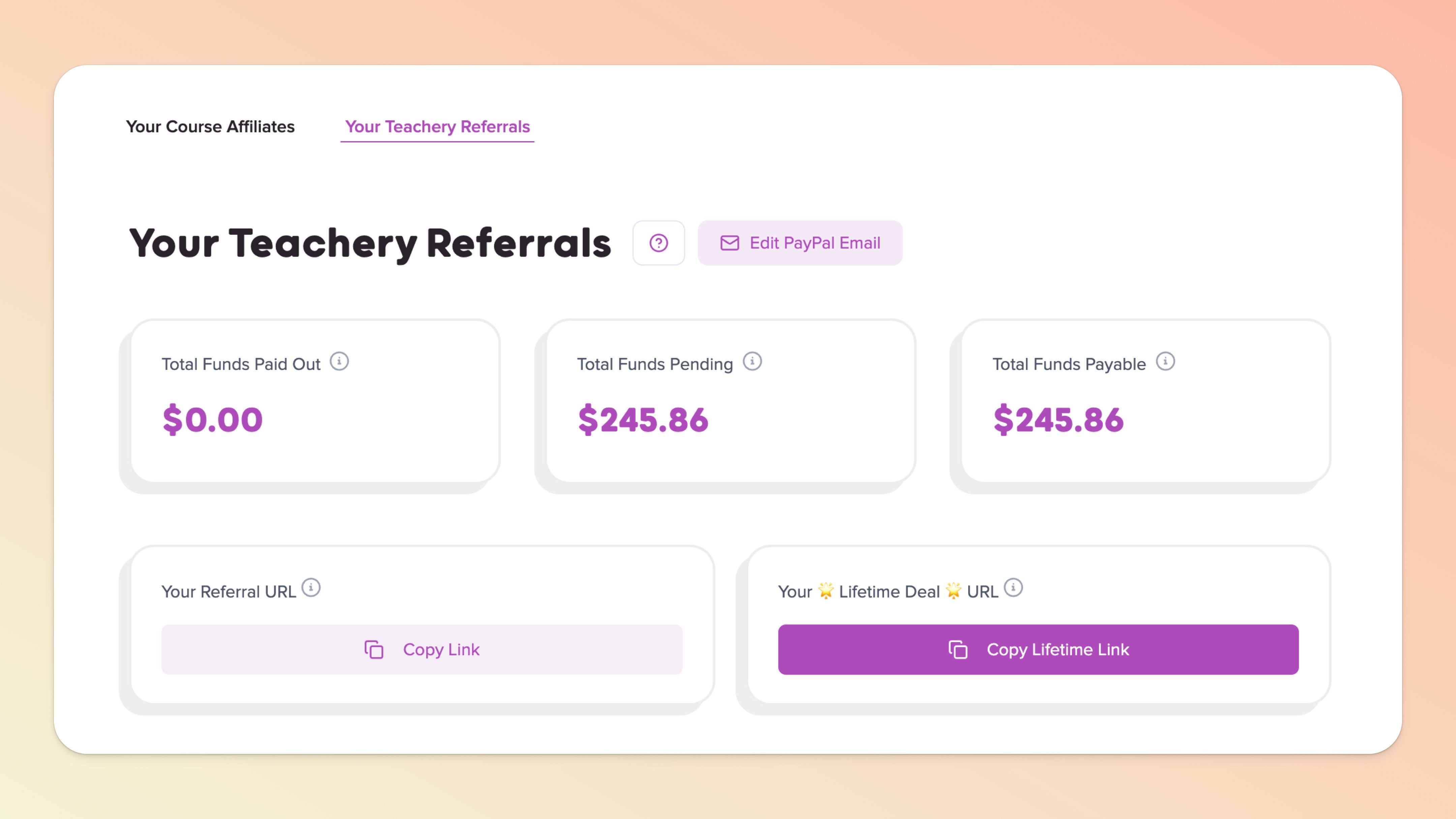 A couple of additional things regarding Teachery Referrals...You will need a PayPal address for your Teachery Referrals account. This may be separate from your Teachery account email, which is perfectly normal. When you have a successful affiliate sale, we'll pay you via PayPal...