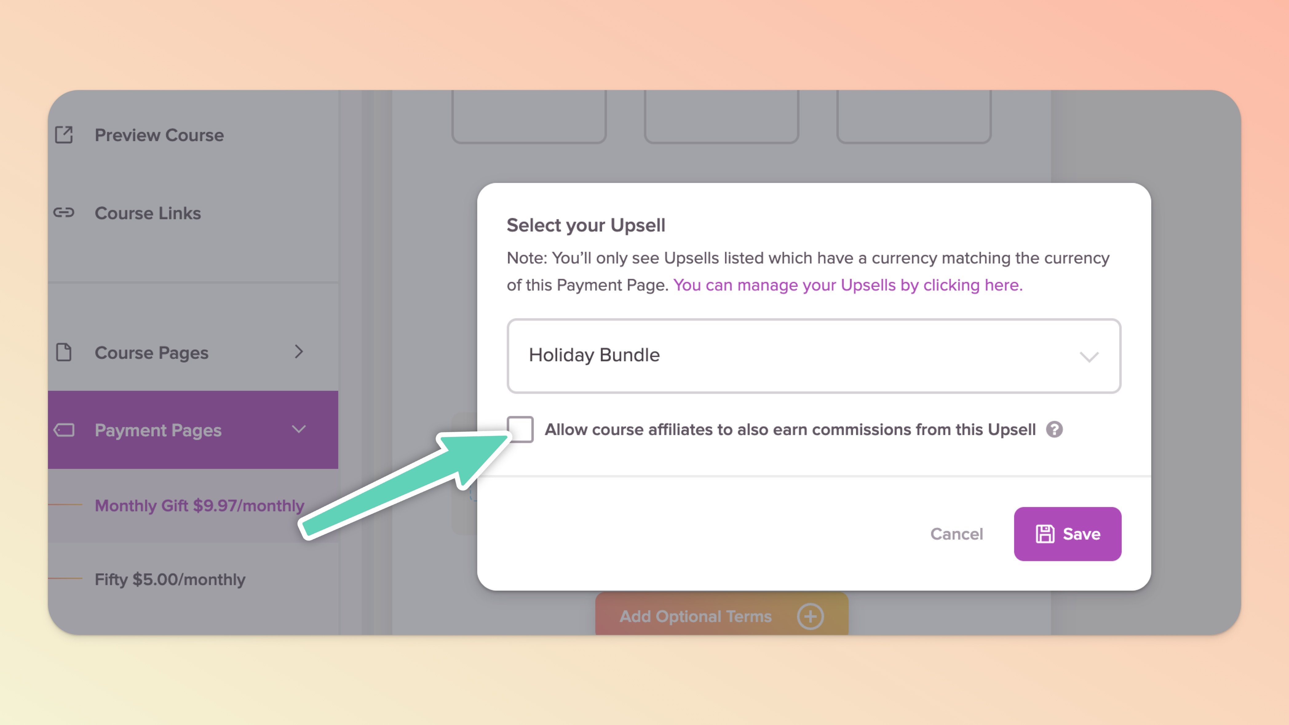 By checking the "Allow course affiliates to also earn commissions from this Upsell" option, the existing Course Affiliate commission percentage you set for your affiliate will be inherited during the checkout process.