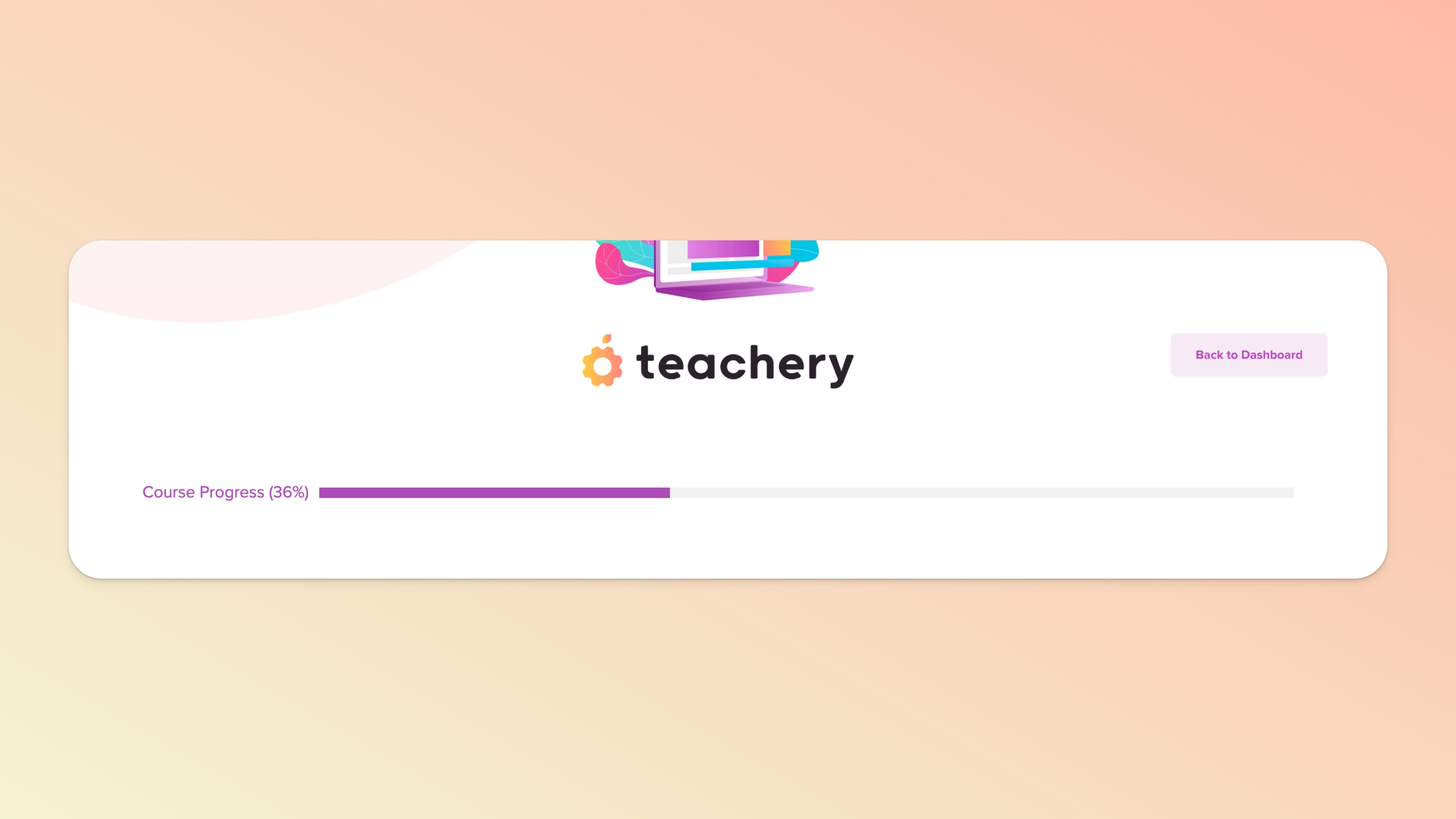 A Note about Previewing the Progress Bar ("36% Progress")When you're logged in as the course creator, the progress bar will show "36% progress" no matter what you do. We'll save you the technical reasons why the progress bar never changes when you preview your course.
