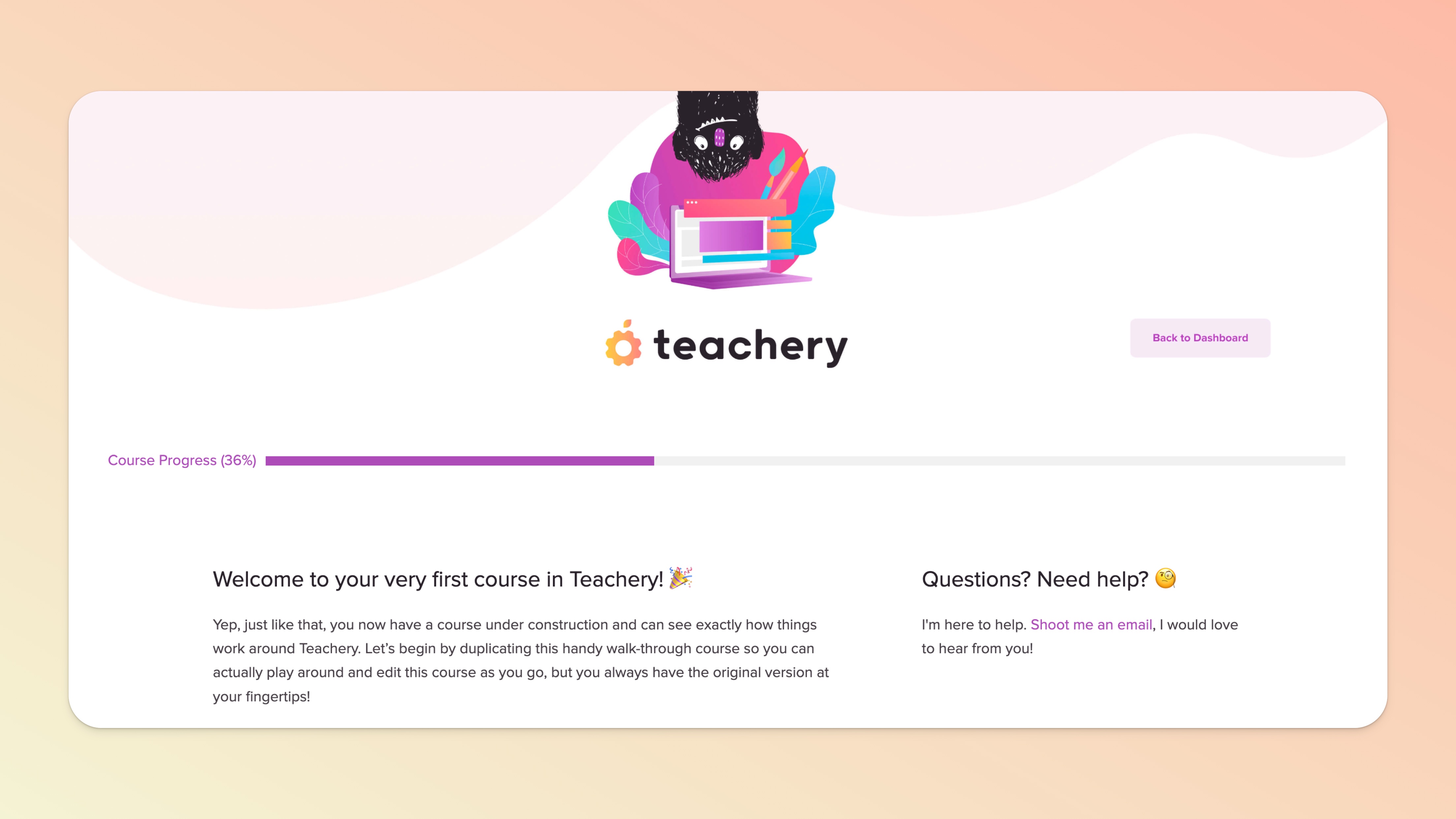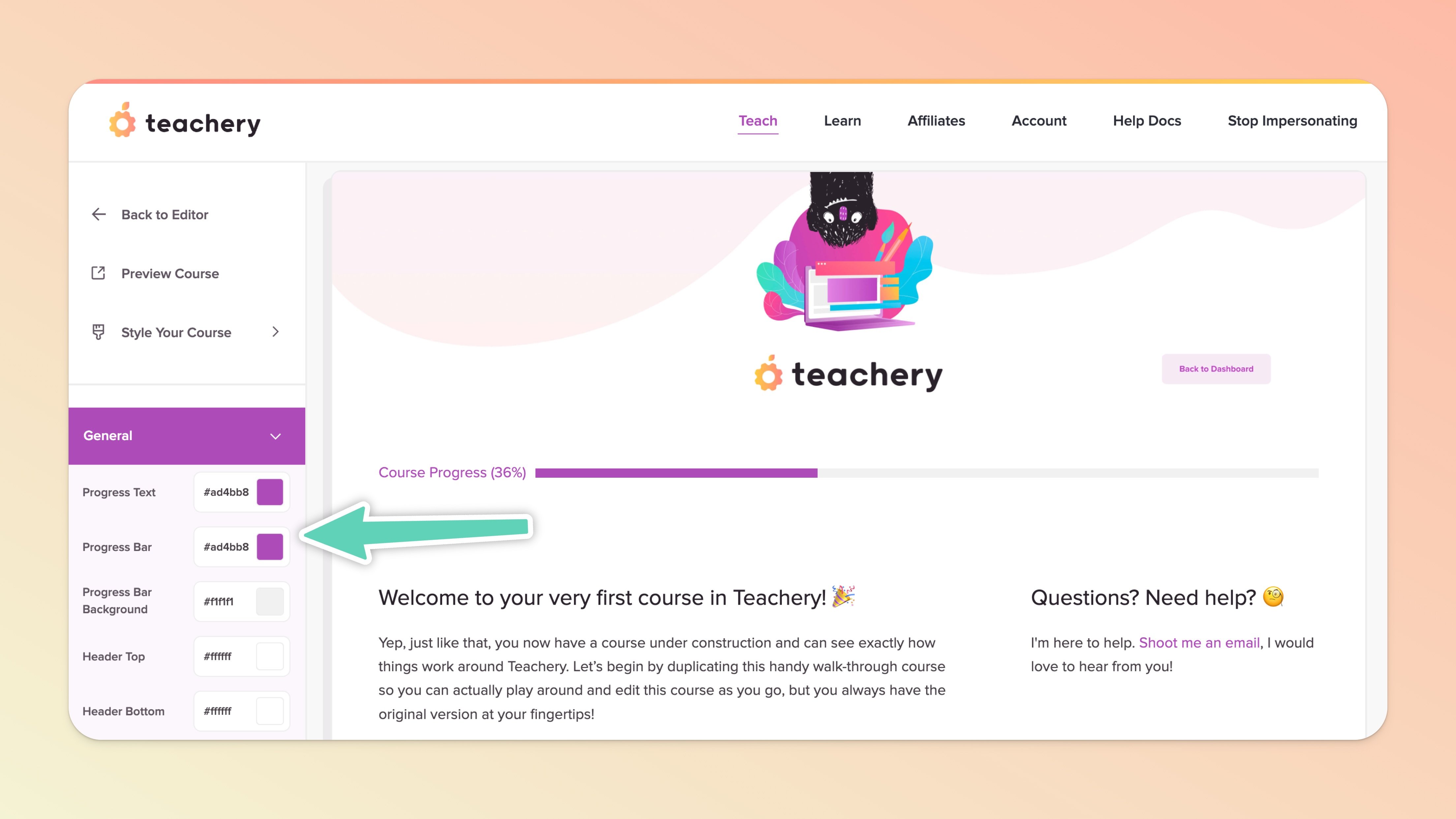 That being said... If you want to see the progress bar change, you'll want to add yourself as a customer of your course (reminder: use an email address that is NOT your Teachery account email address).