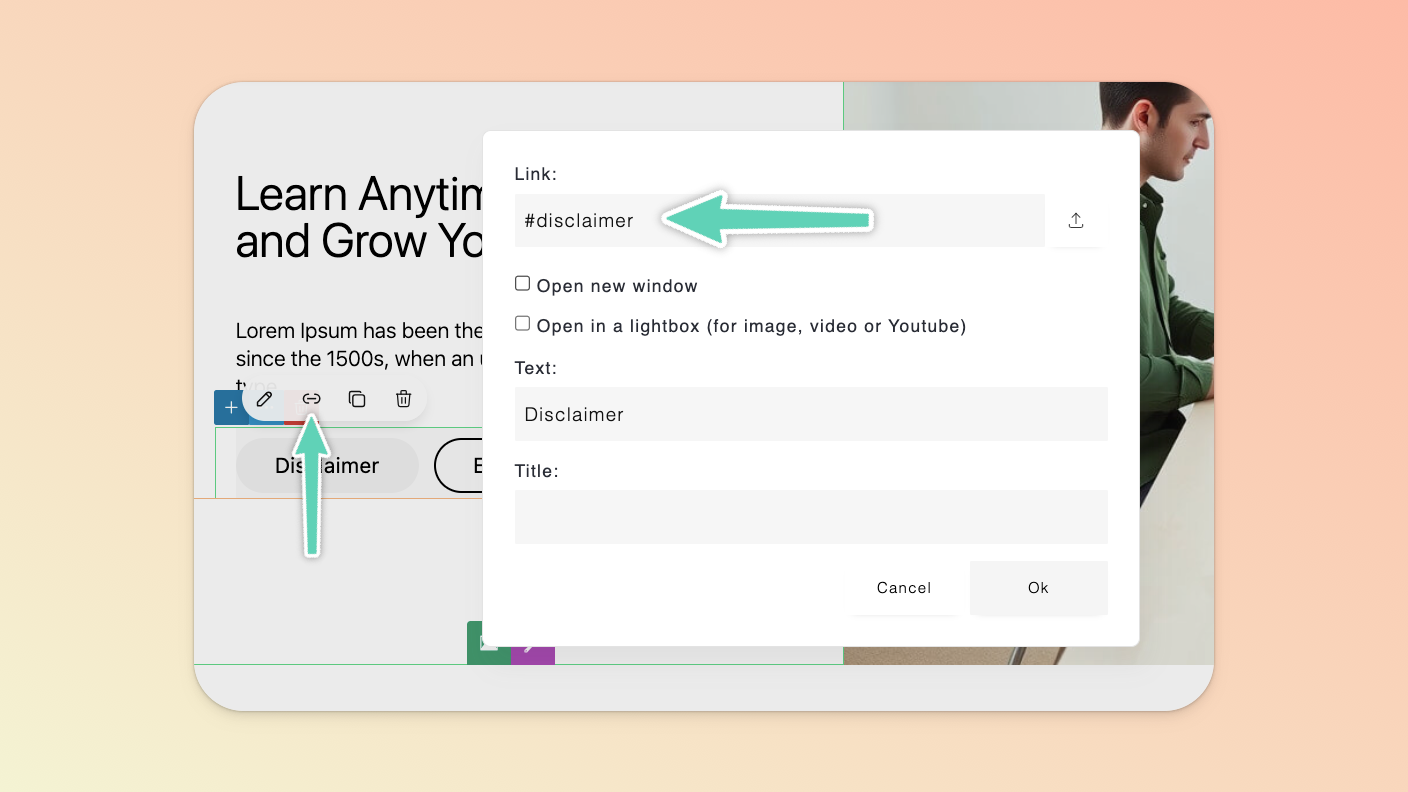 Return to the menu item or button or text you want to hyperlink and, in the Link field, insert # followed by the label you just set and click Ok save your changes.