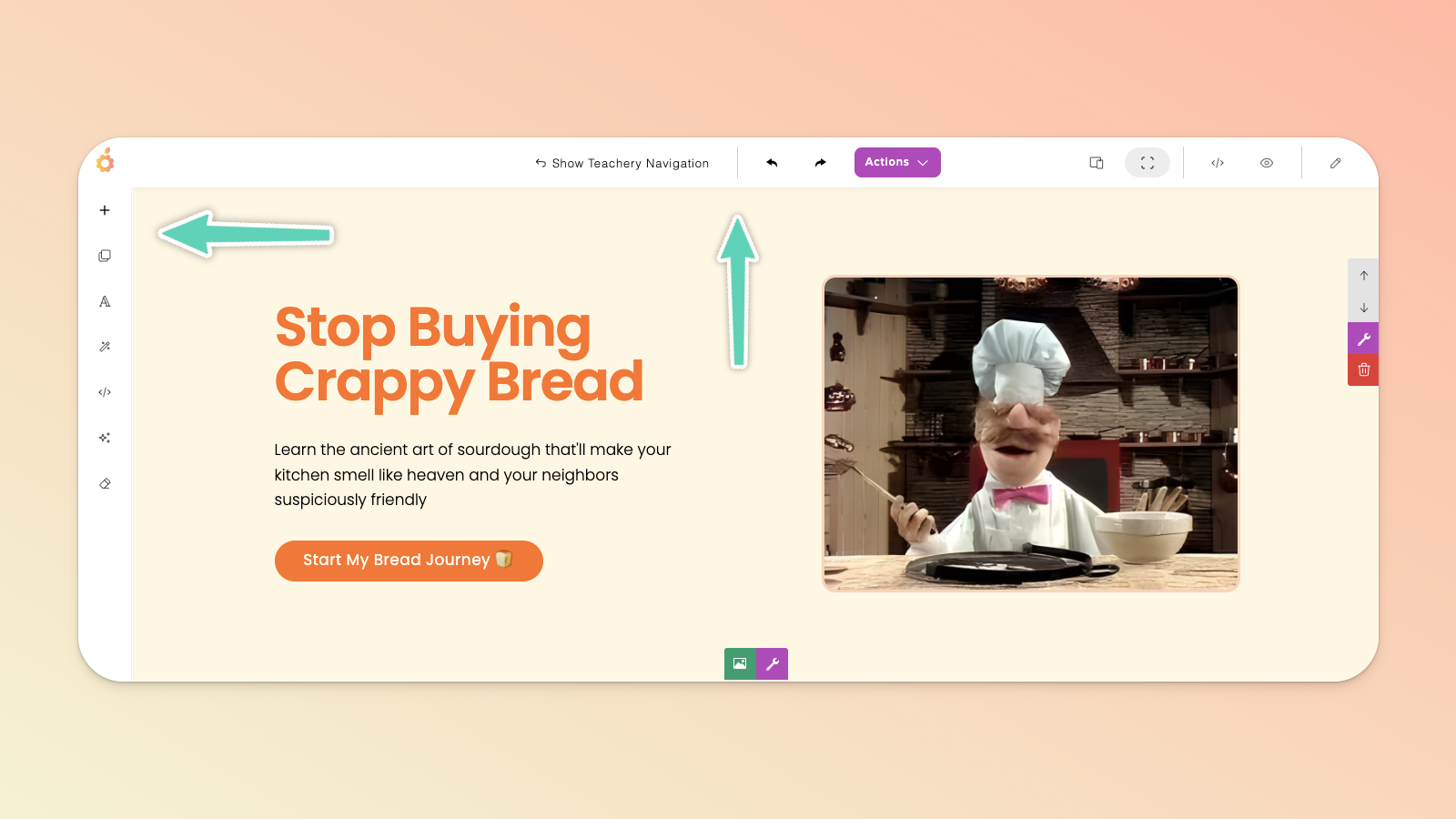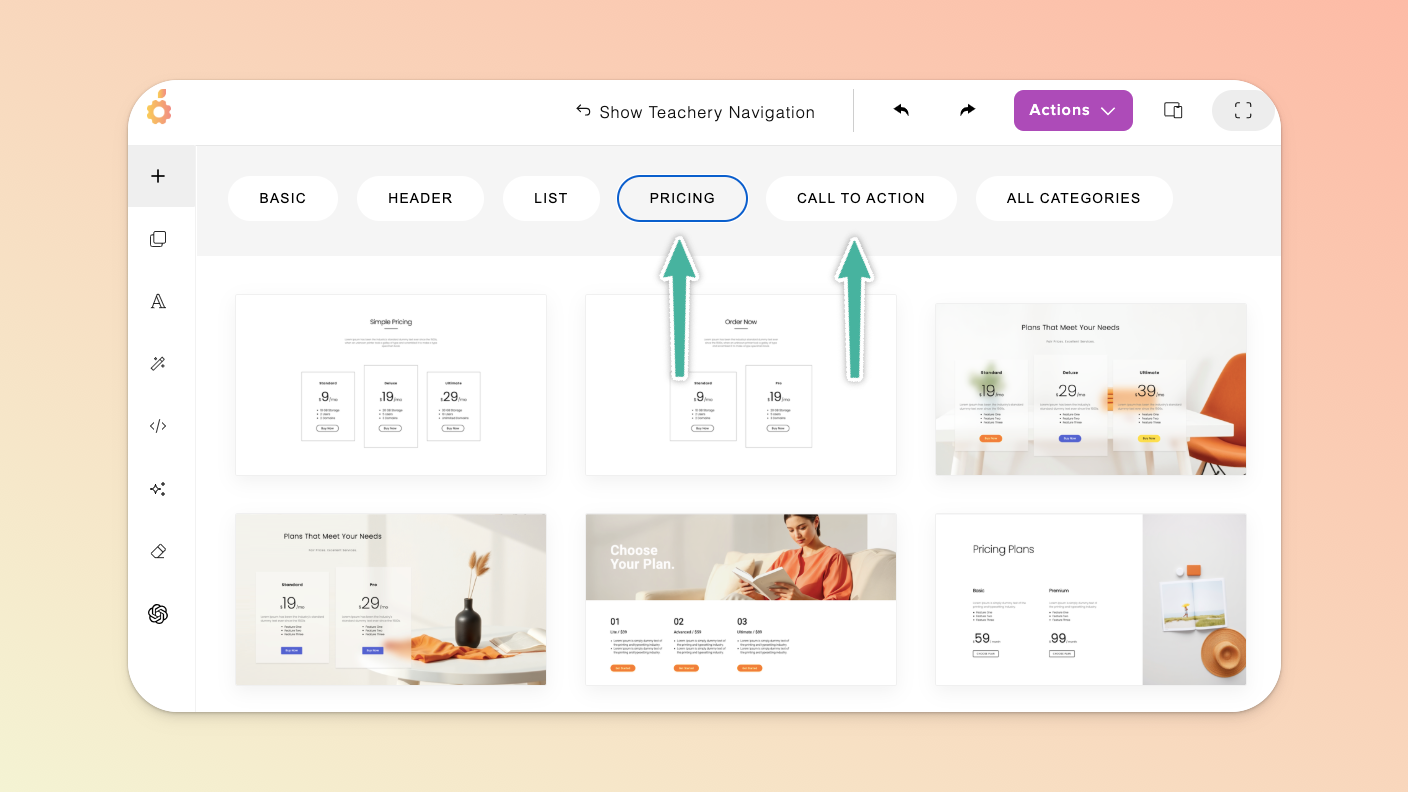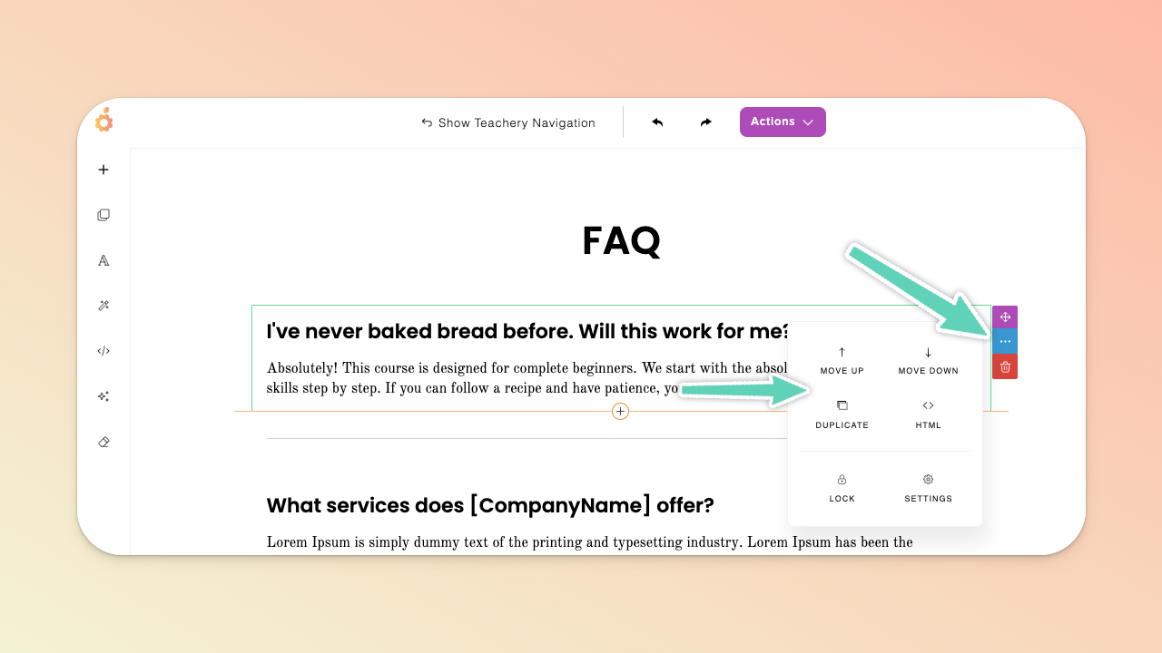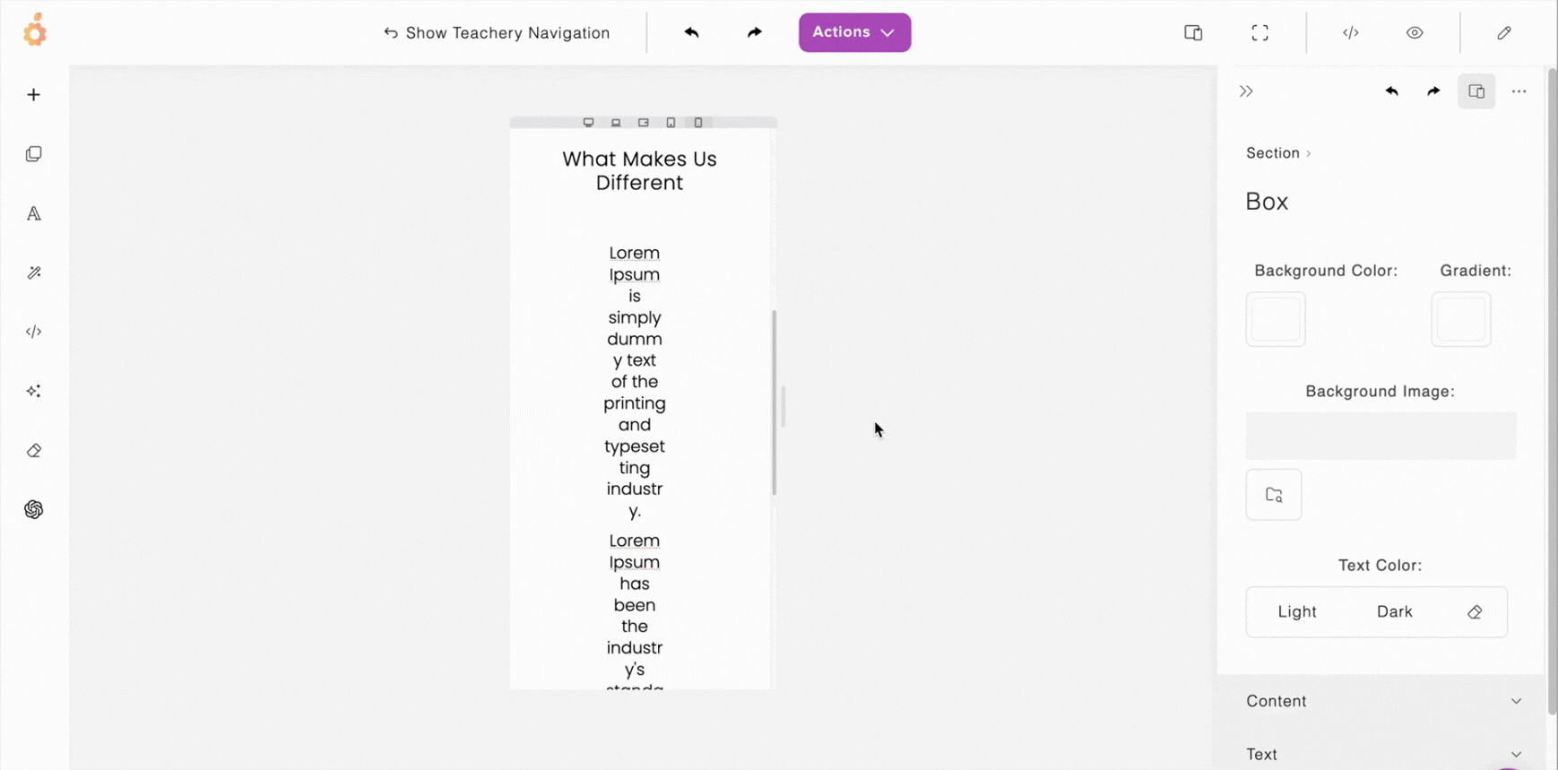 The TOP menu allows you to show/hide the standard Teachery sidebar navigation you’re used to, undo/redo an action, manage/duplicate/delete the page via the Actions dropdown button (including managing the page URL, name, and connected email provider), toggle between different device views (so that you can check the page’s responsiveness on, for example, a mobile device), switch to full view, open a preview in a new tab, or keep the edit panel open.