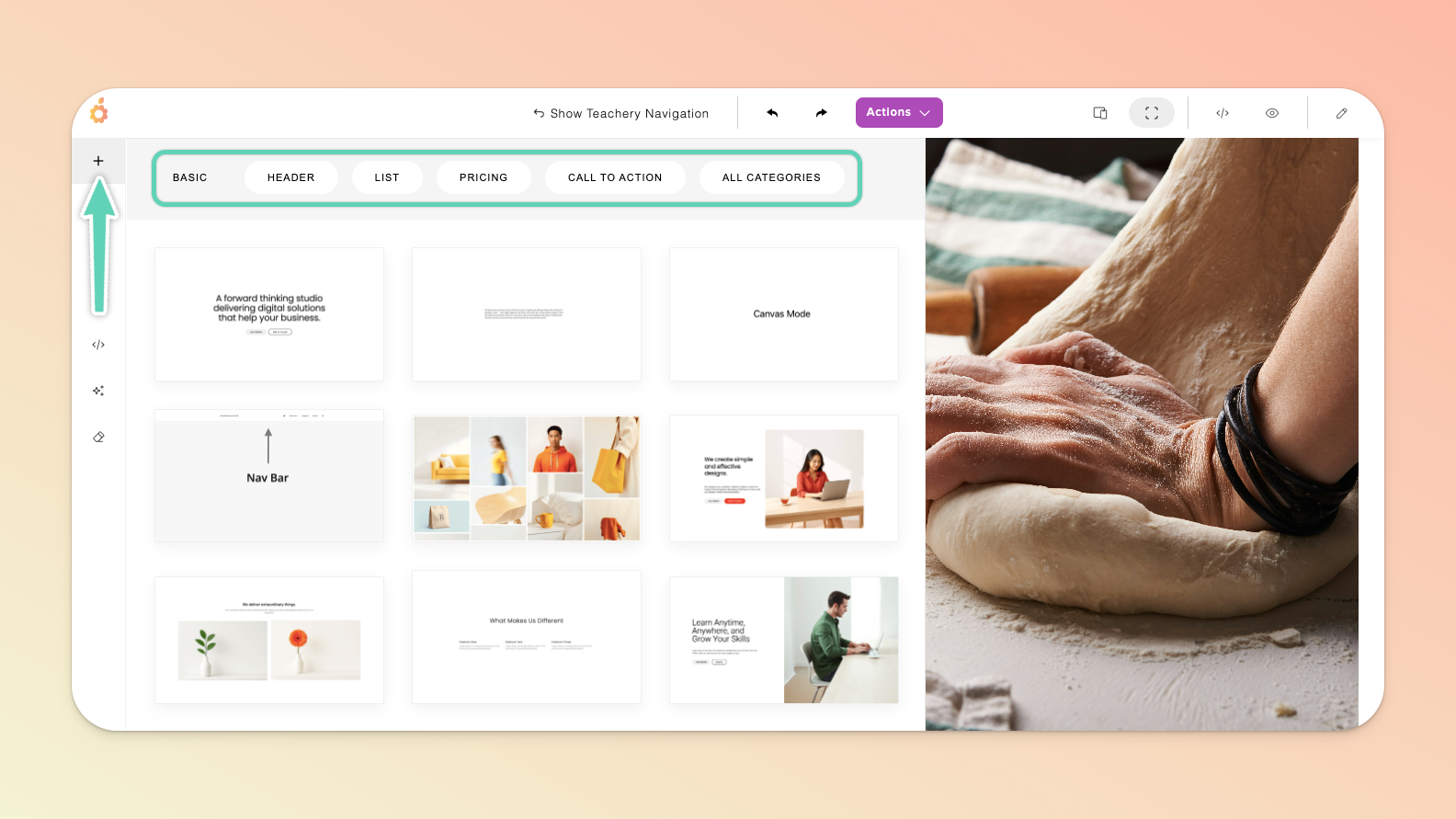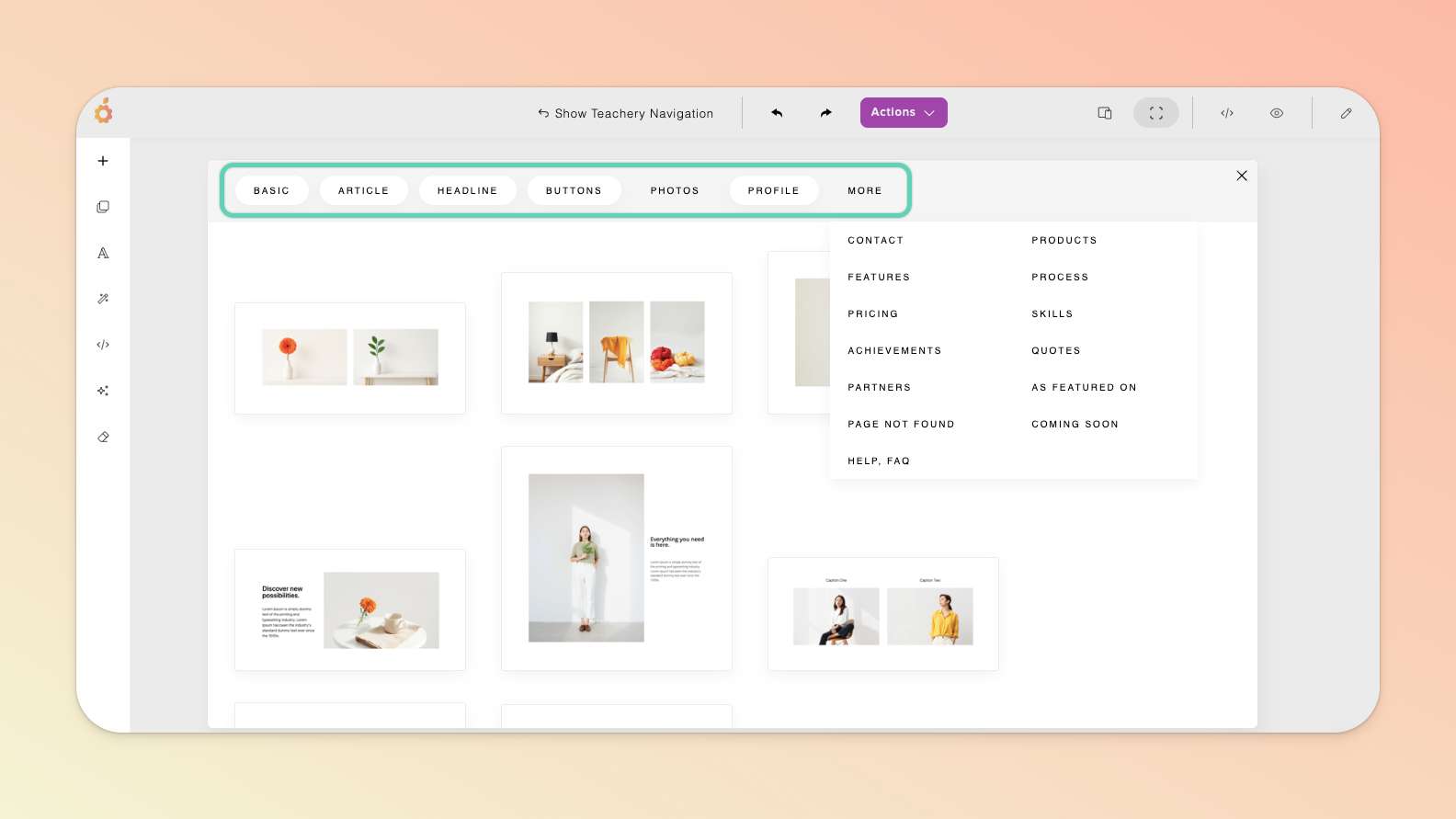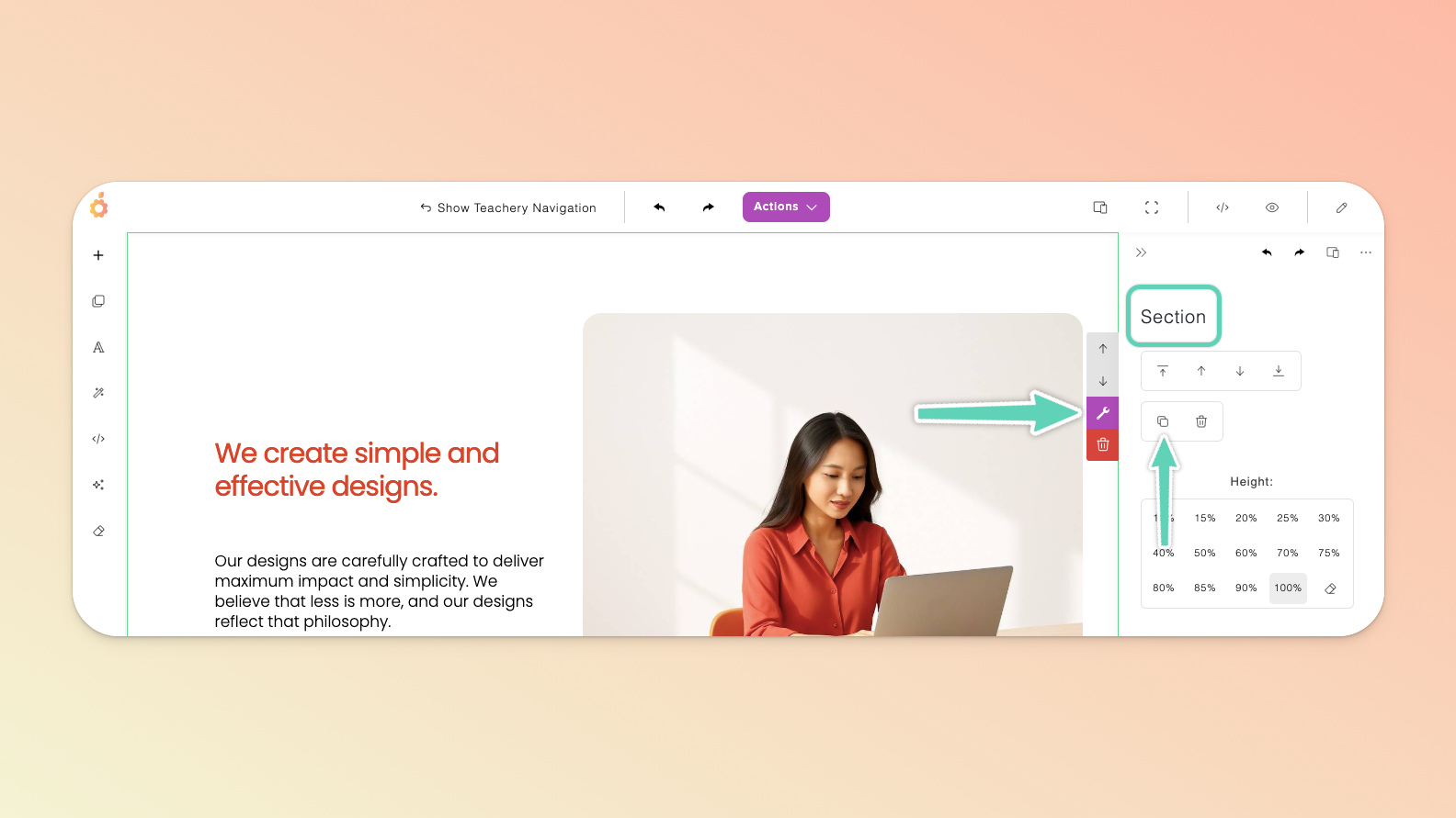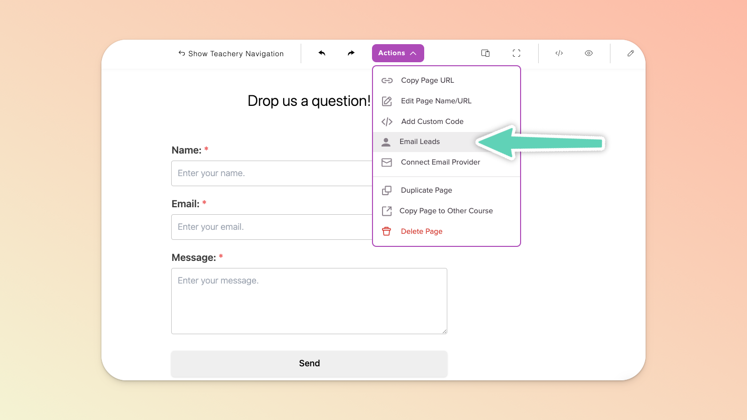 The TOP menu allows you to show/hide the standard Teachery sidebar navigation you’re used to, undo/redo an action, manage/duplicate/delete the page via the Actions dropdown button (including managing the page URL, name, and connected email provider), toggle between different device views (so that you can check the page’s responsiveness on, for example, a mobile device), switch to full view, open a preview in a new tab, or keep the edit panel open.