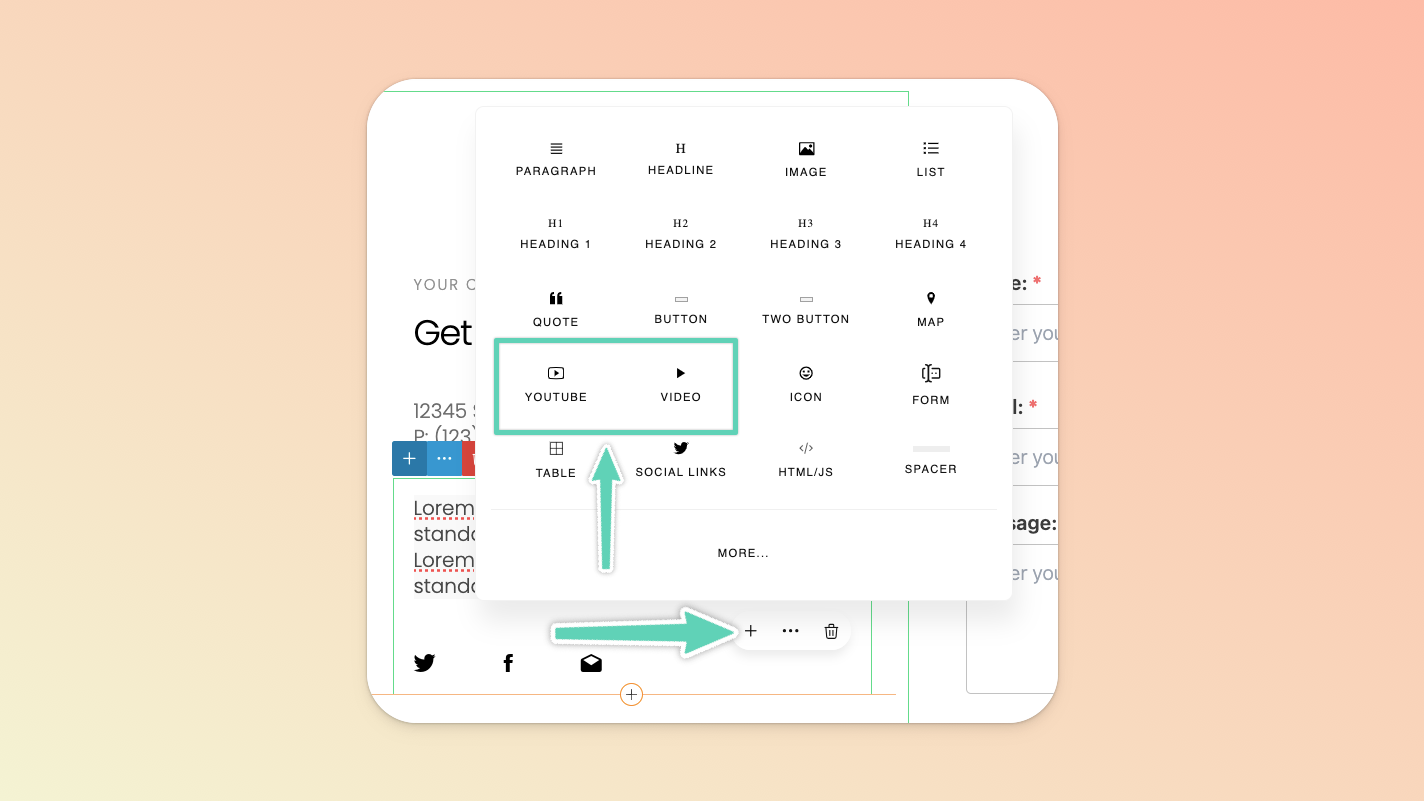 There are two ways to add an inline video: either add an entirely new section that already includes an inline Video element (click the + icon in the Page Builder’s left main menu to find a section you like) or click the + icon of an existing element in your content (e.g. a text box) and select the Video or Youtube element option (pictured below).