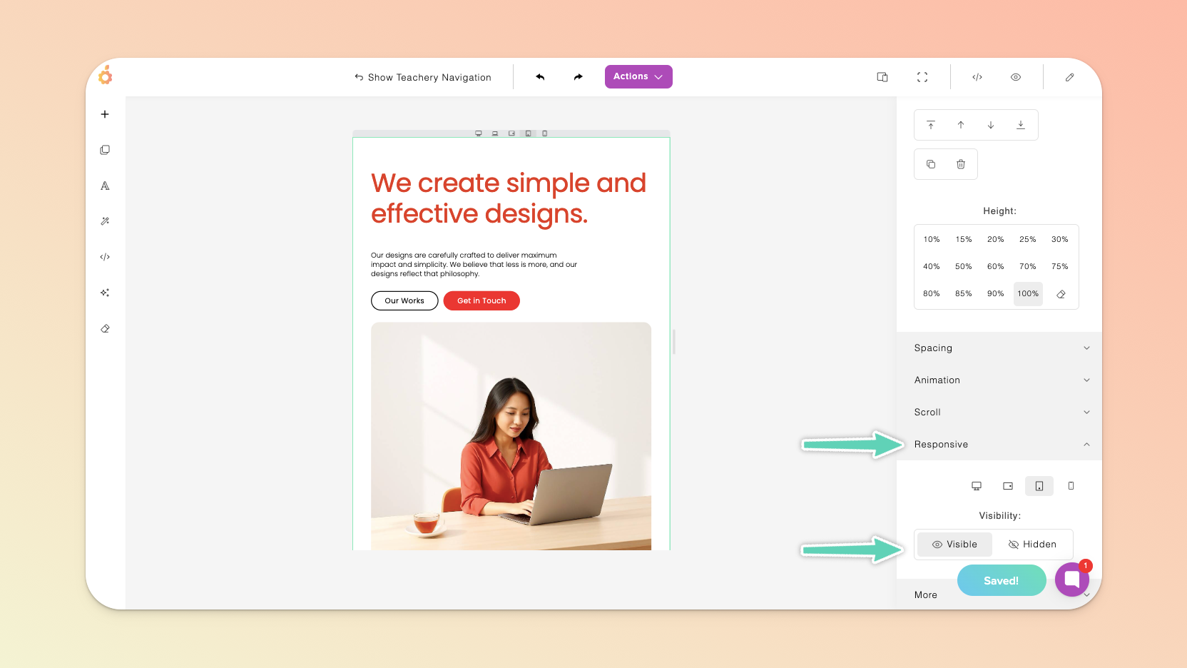 The visibility setting in particular enables you to hide an element/section on certain devices. Simply select the relevant element or section and modify the Visibility in the Responsive settings.