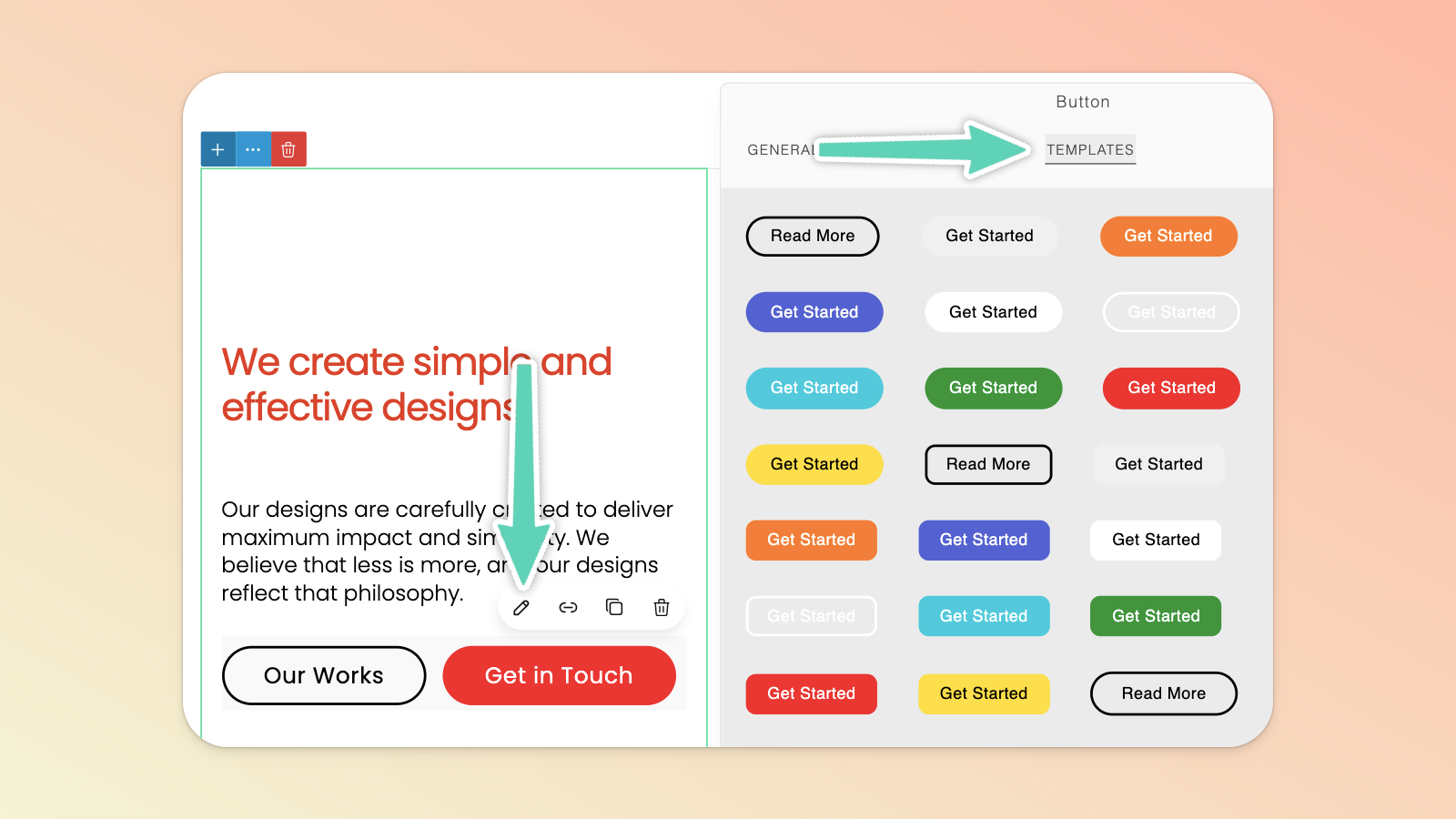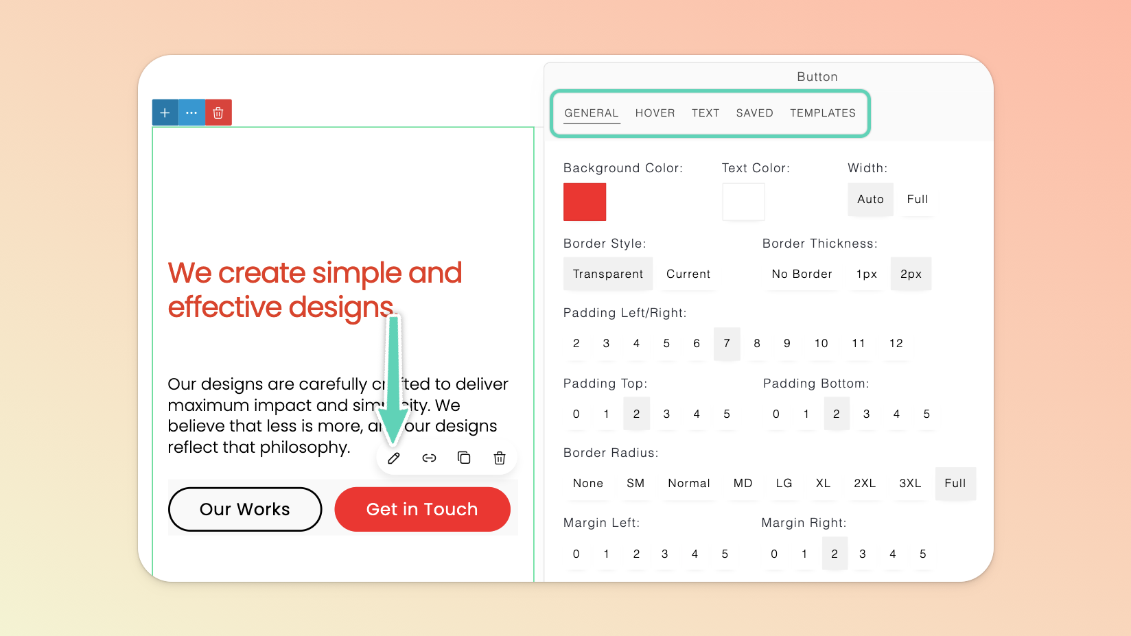To edit a button, you need to ensure you have the button itself selected and look for the pencil icon to open its unique edit/settings panel; which has an extensive list of configurations e.g. hover colors, padding, and rounding of corners.