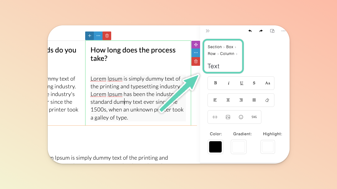 The edit/settings panel (on the right) gives you an indication of which element you’re currently editing (in this case, the text).