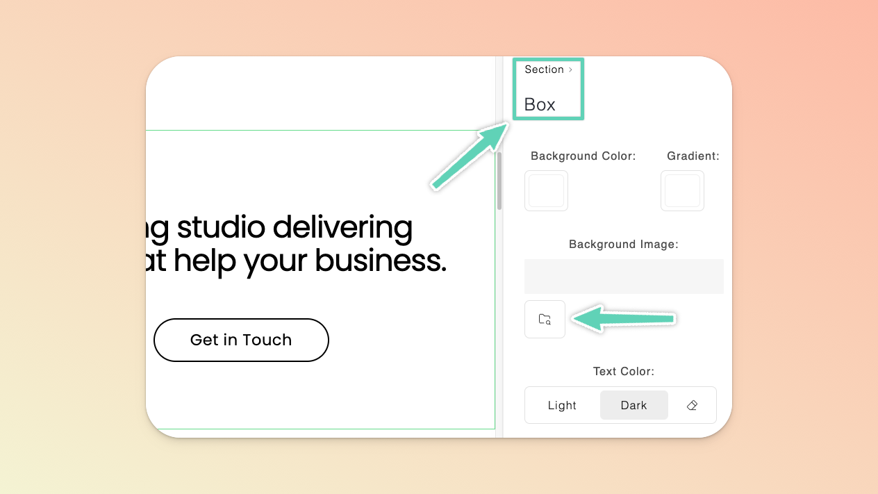 Adding background images is easy as most section types will enable you to set a background image (as opposed to videos which can only be uploaded to a particular type of section). Simply select the box element of the relevant section (you can do so by selecting a smaller element within the section and then clicking Box in the “breadcrumb” visible in the edit/setting panel on the right of the screen). Once there, click the file manager (folder) icon to find the image you need.