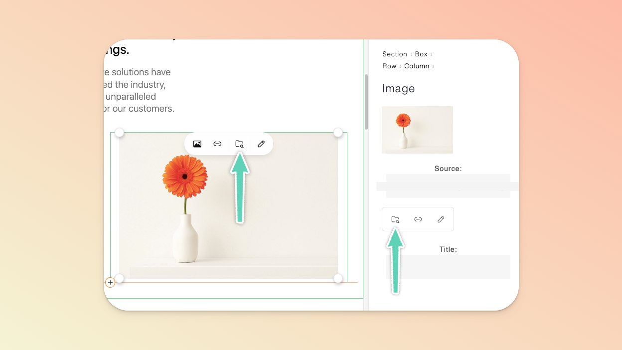 In either case, simply replace the default image by selecting that image and clicking the file manager (folder) icon (either from directly in the image or via its edit/settings panel on the right of the page). Once in the file manager, import a new image from your computer or select one already in your file manager and click Select.