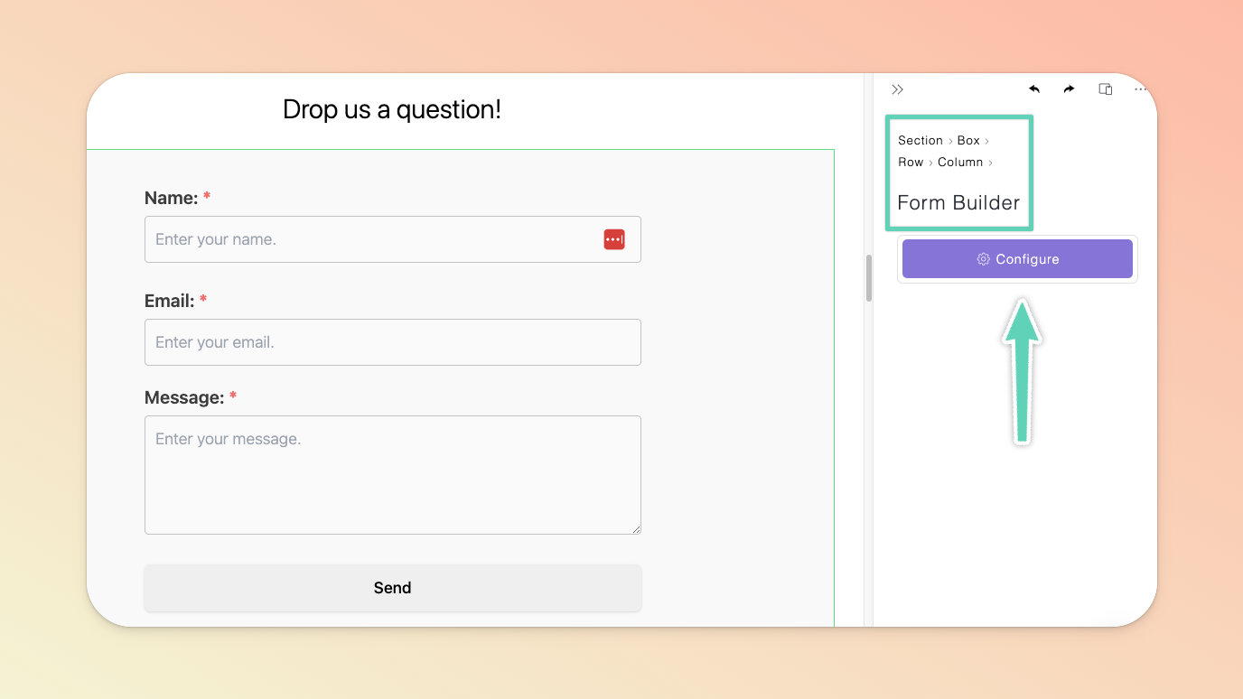To modify the form’s text and styling, select the form and click the gear icon within it or, if the edit panel is open, the Configure button.