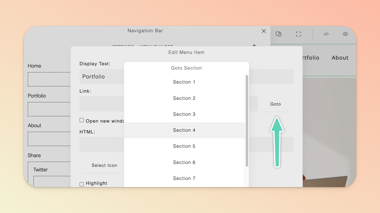 To link a menu item to a section of your page, open the edit popup for the menu item, and click the Goto button beside the Link field, select the section you’re wanting to link to, and then click the Update button to save your changes.