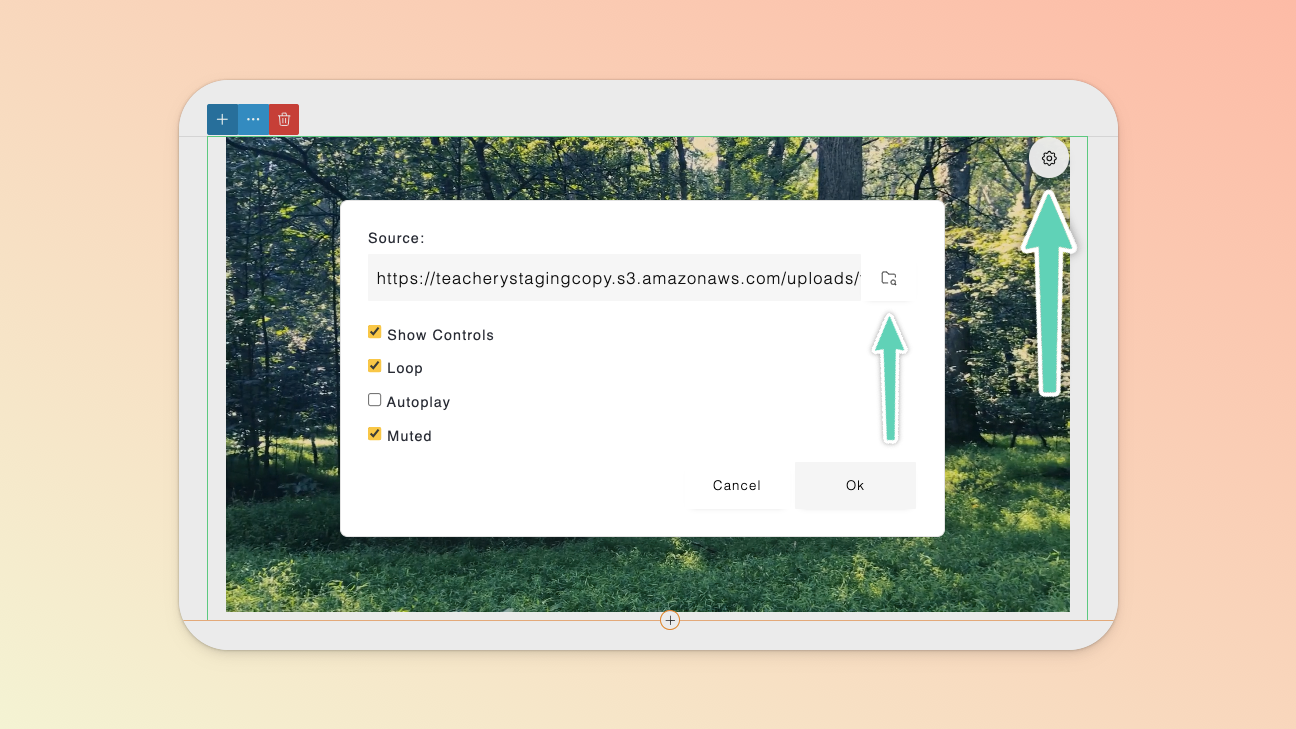 Alternatively, you can use the standard Video element to upload a video (<50MB in size). Simply replace the default video by selecting that video, clicking the gear icon to open its settings and then clicking the file manager (folder) icon. Once in the file manager, import a new image from your computer or select one already in your file manager and click Select.
