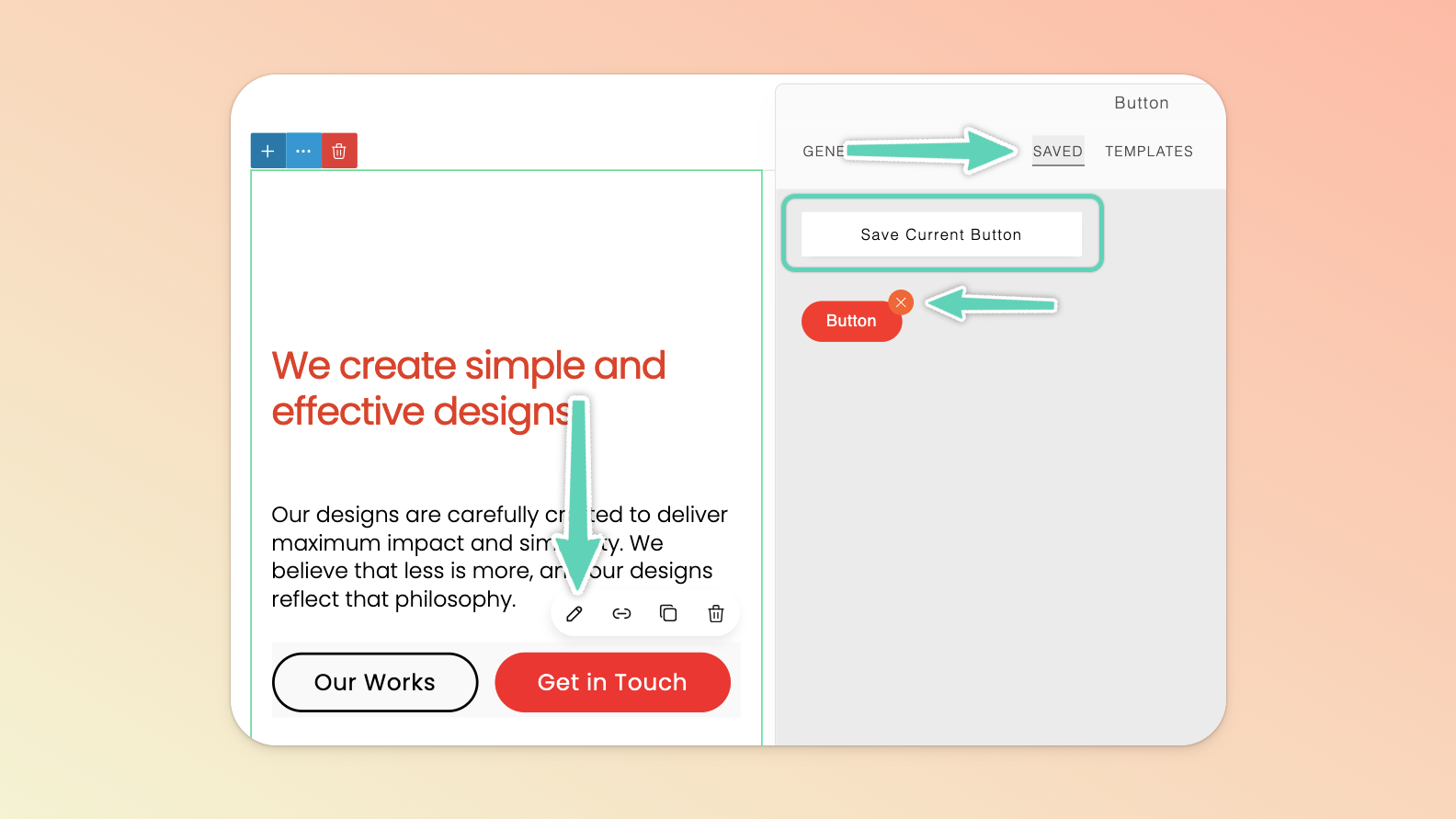 You can save any button styles you create in the Saved tab of the edit/settings panel. To apply a saved style, return to the Saved tab and click the style you wish to apply (it’s here you can also delete any saved styles, by clicking the “X” that appears on hover).