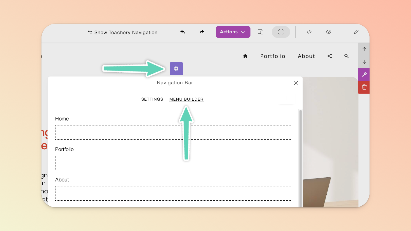To make changes to the menu items in your navigation bar, select the bar, click its gear icon, and in the popup that appears select the Menu Builder tab.