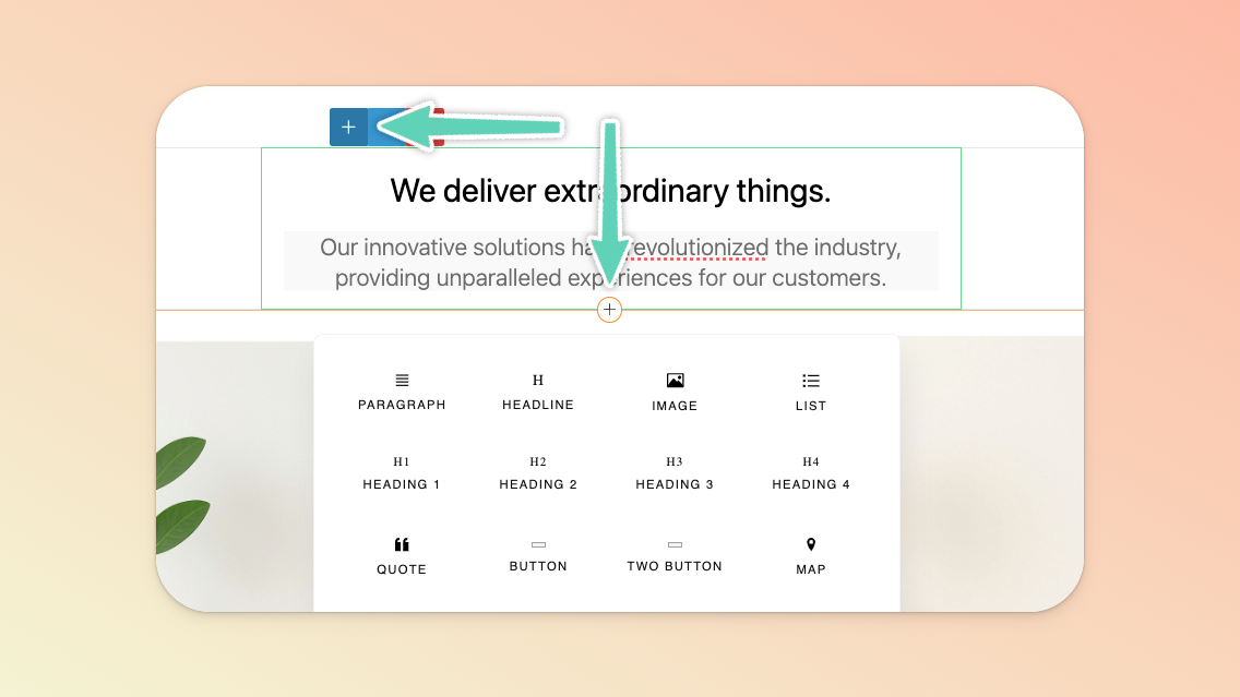 Once you have at least one section, you can also just continue to use the inline + icon that appears below an existing element you have selected to add more elements. To add more elements to the left or right of an existing element, click the + icon at the top of the element.