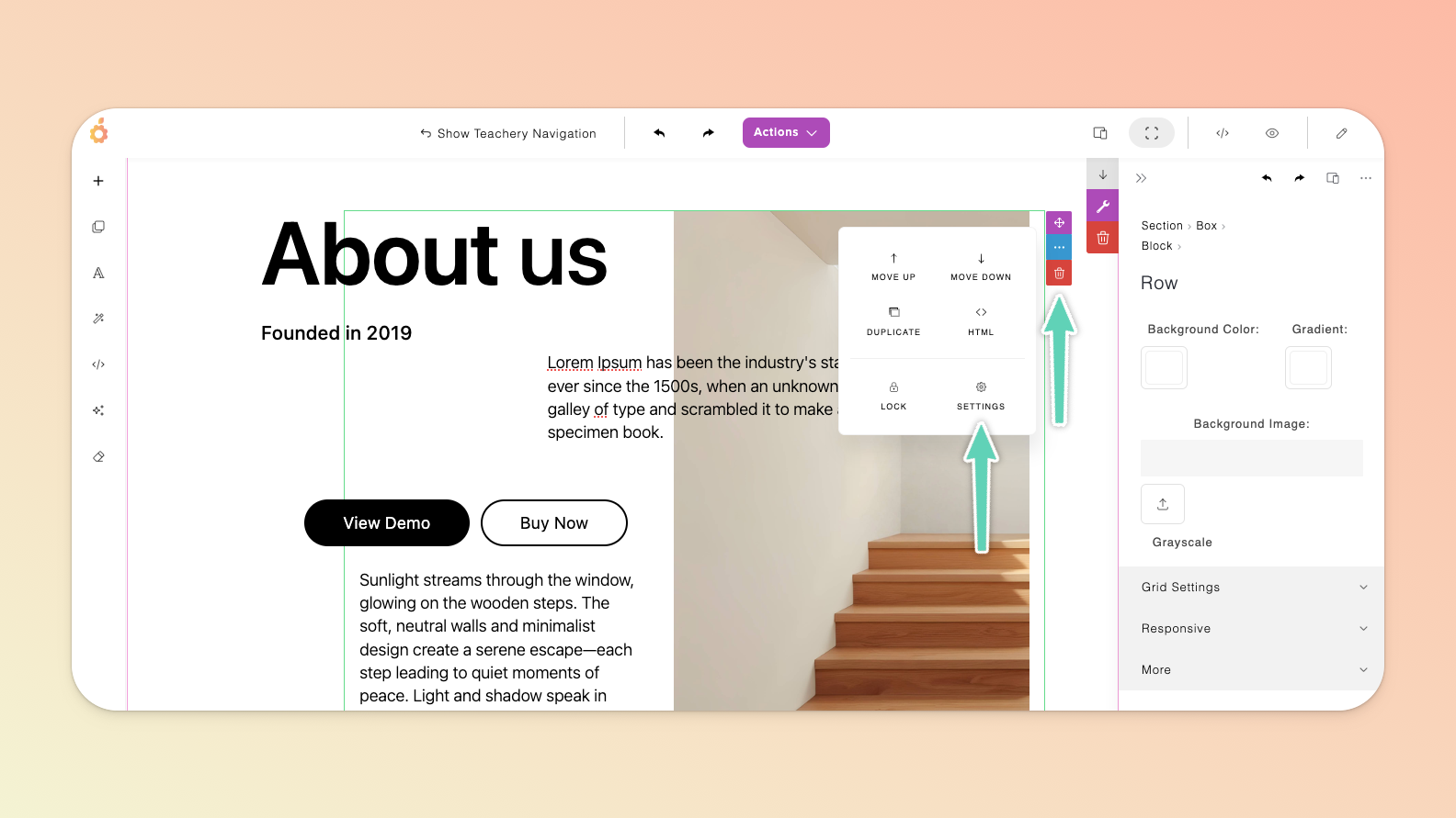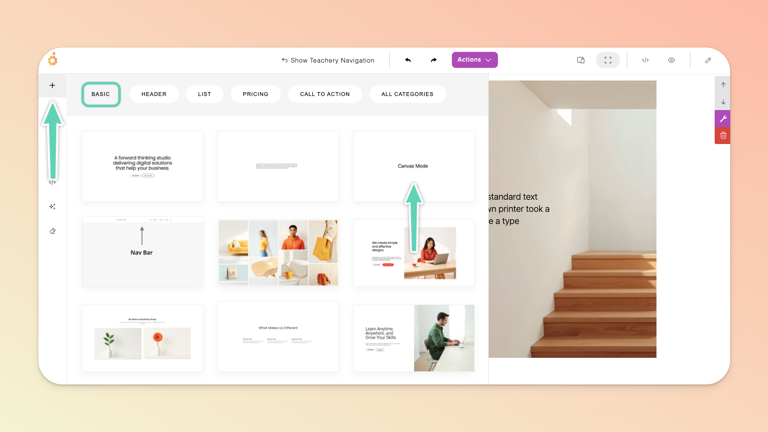 Canvas ModeThis feature allows you to build out sections in a more freeform way. That is, you can more freely add and drag elements (a.k.a blocks) around as you like. That said, we recommend only more advanced users give it a try.