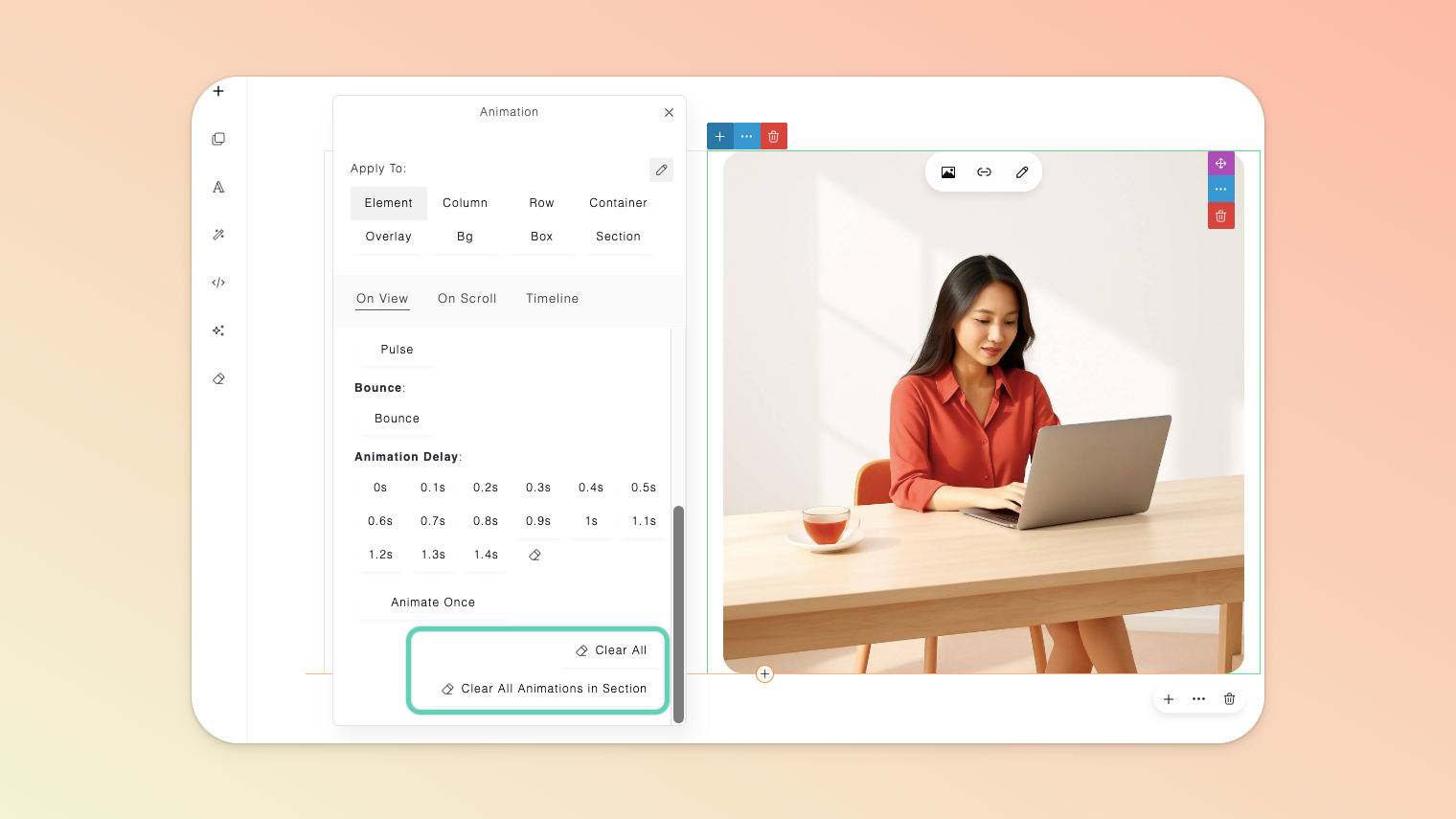 To clear all animations from the entire page or just the selected section, use the Clear All or Clear All Animations in Sections button available at the very bottom of the animations panel.
