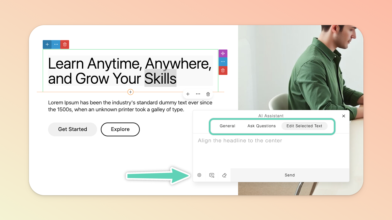 AI AssistantWith the use of prompts, you can have AI assist you in adding new custom sections, making visual/style changes, and drafting copy/text.