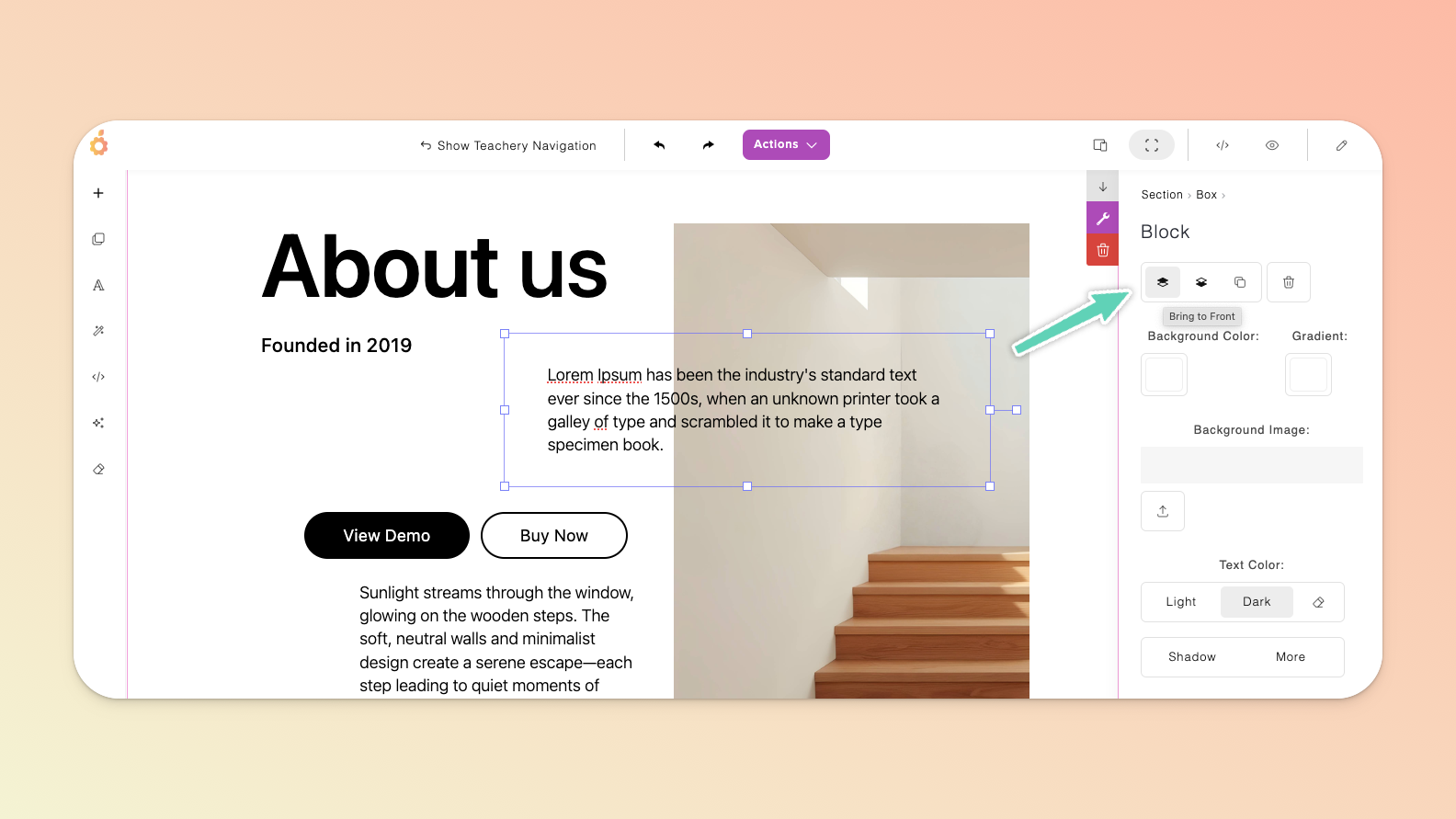 If you’re in standard edit/settings mode and you want to be able to drag and/or resize an element again, simply click out of it (anywhere else on the page) and then click on it once. In this mode, and with the edit panel open, you can also change a few settings including how the different elements/blocks are arranged e.g. overlapping one in front of the other.