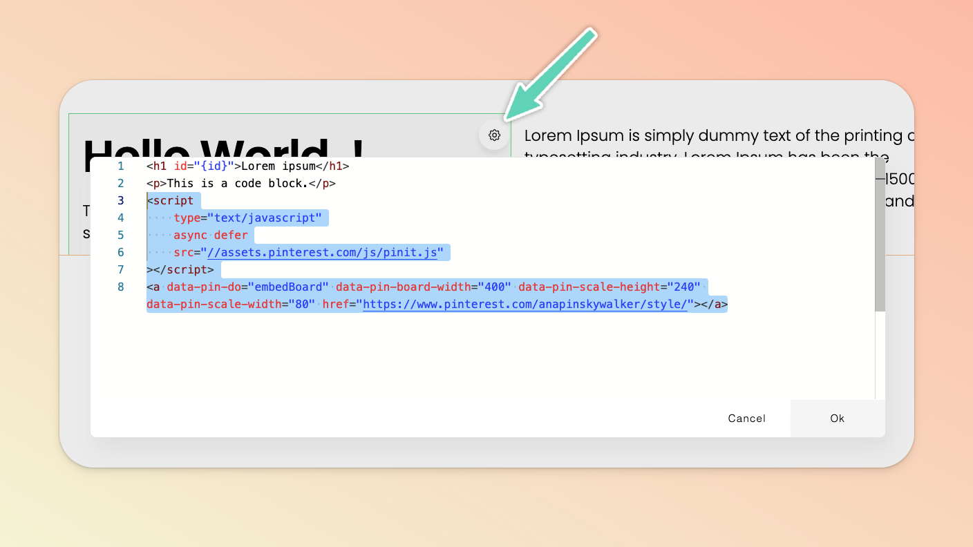 Click the gear icon of the element you just added and replace the placeholder text with your embed code. If the third party platform has provided you with script/head tag/header code, you need to pop it in here too, above/before the “inline” embed code itself. For example, pictured below is the full script and inline embed code for a Pinterest board.