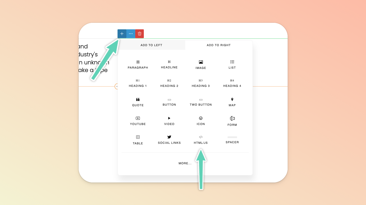 Embeds To embed content with either iframe or more complex code (e.g. script/header code provided by the third-party platform you’re using), click the element beside which you want to add the embedded content and add an HTML/JS element.